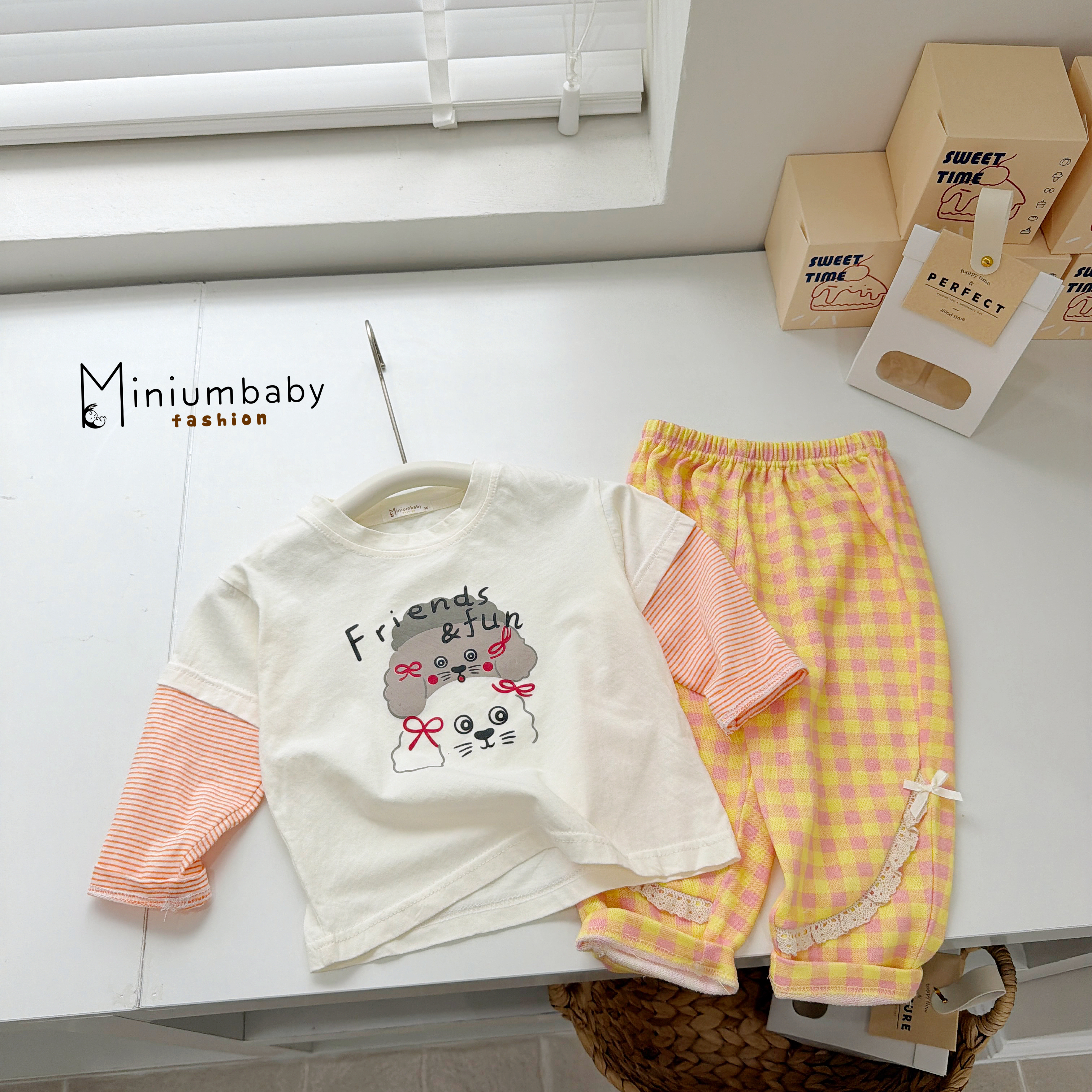 Bộ dài tay bé gái phối tay kẻ in cún friends fun phối quần kẻ