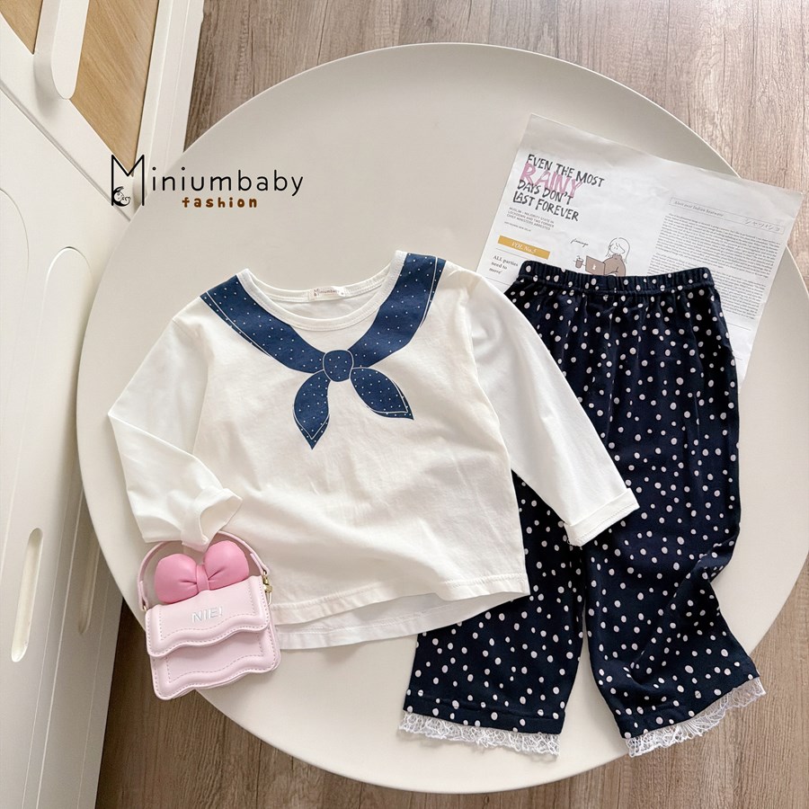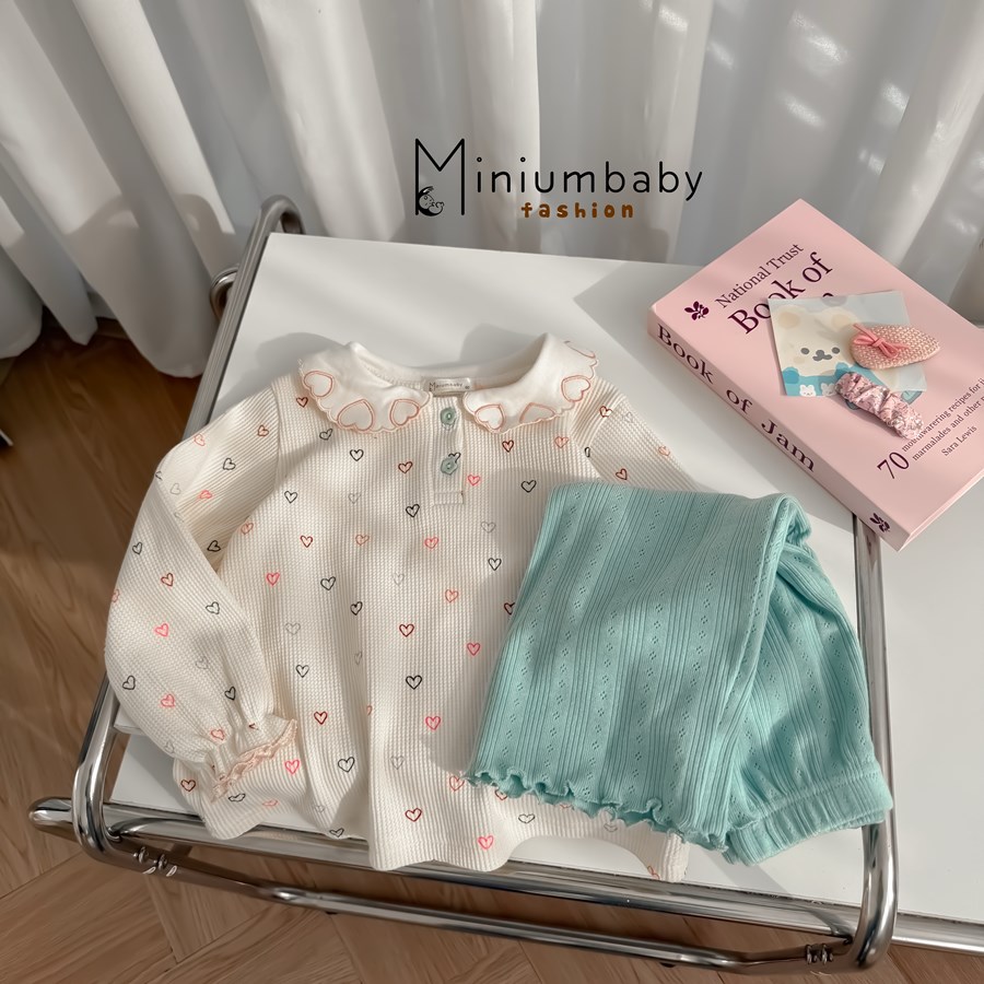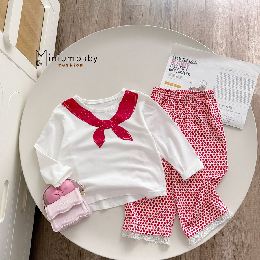 Bộ dài tay bé gái in cổ thắt nơ quần tim bi