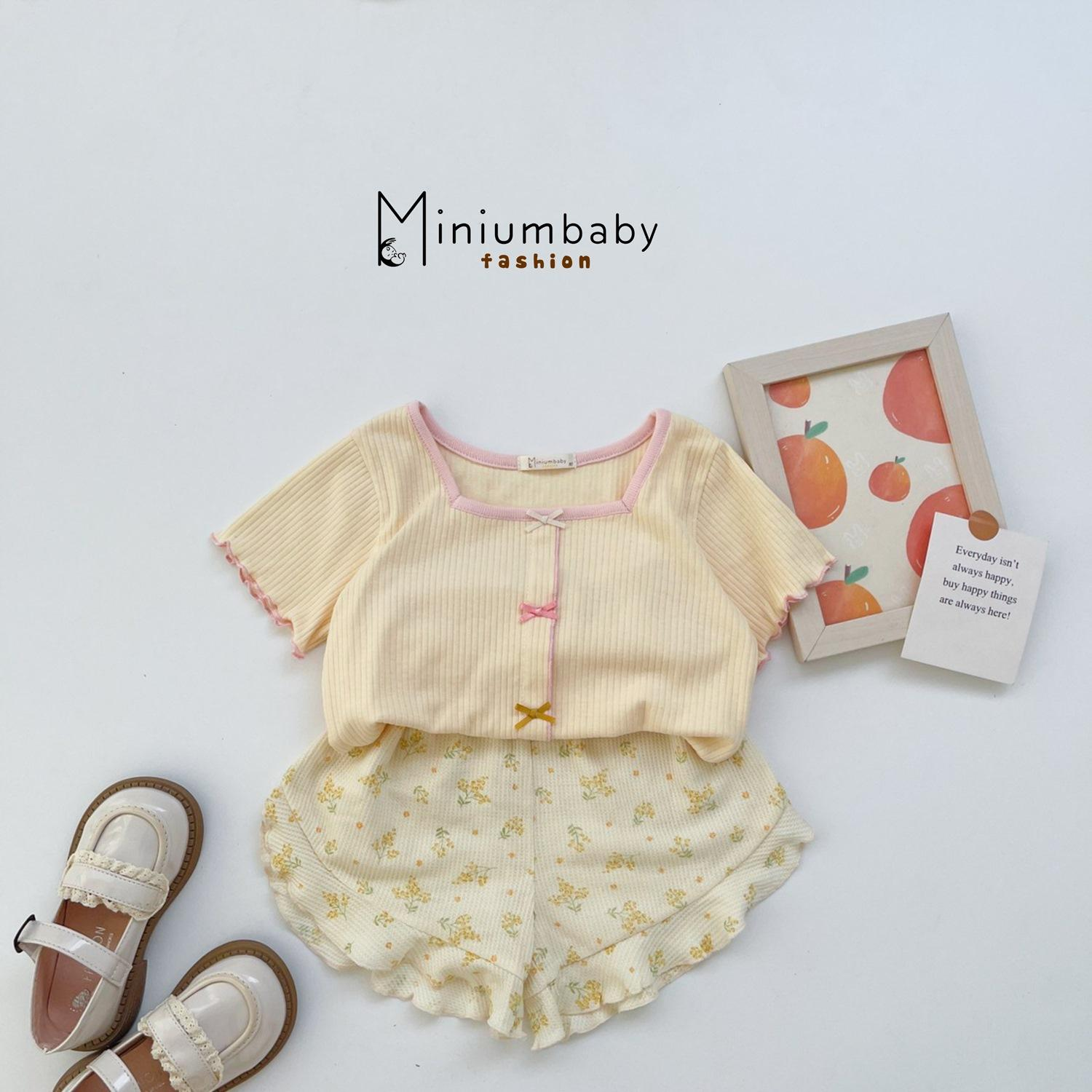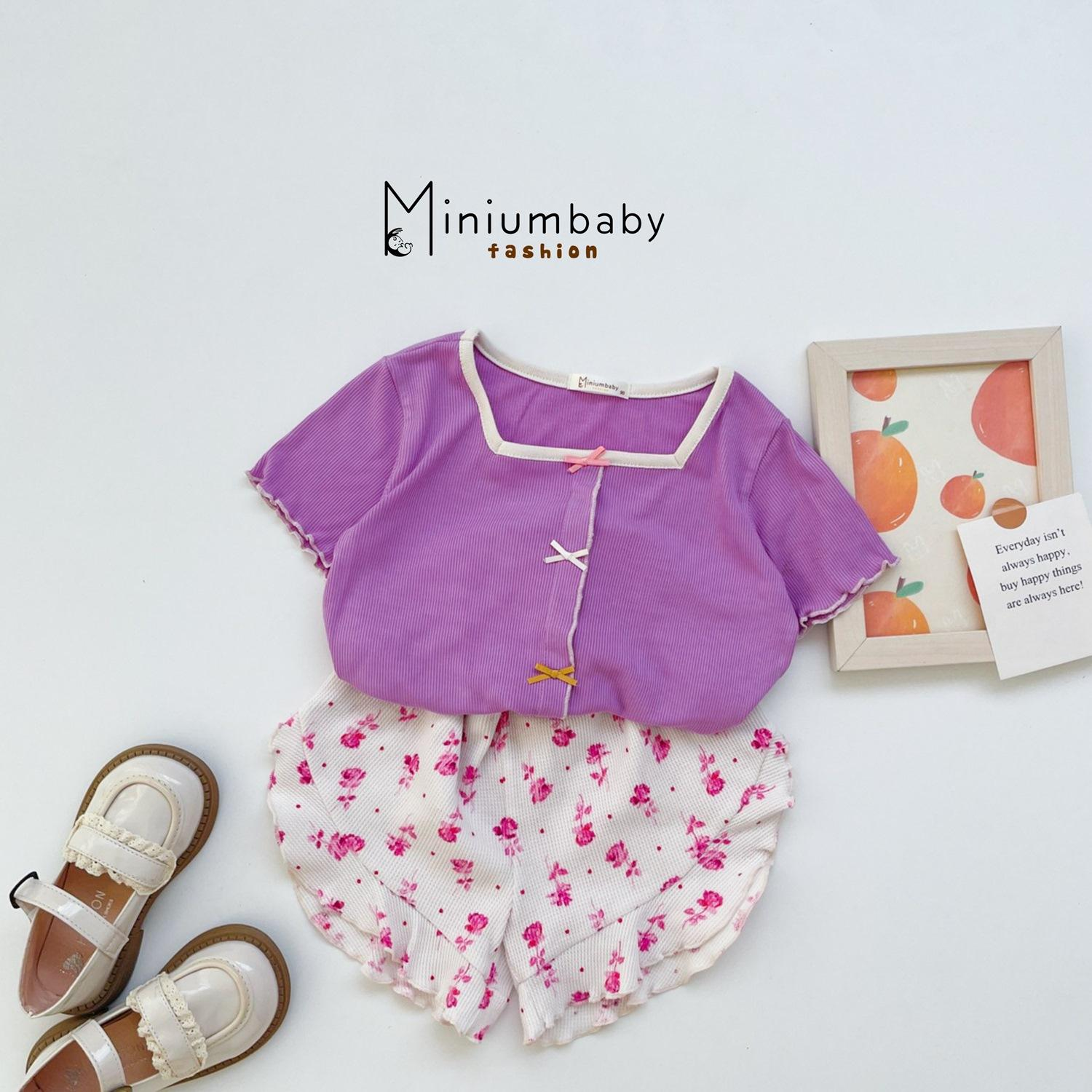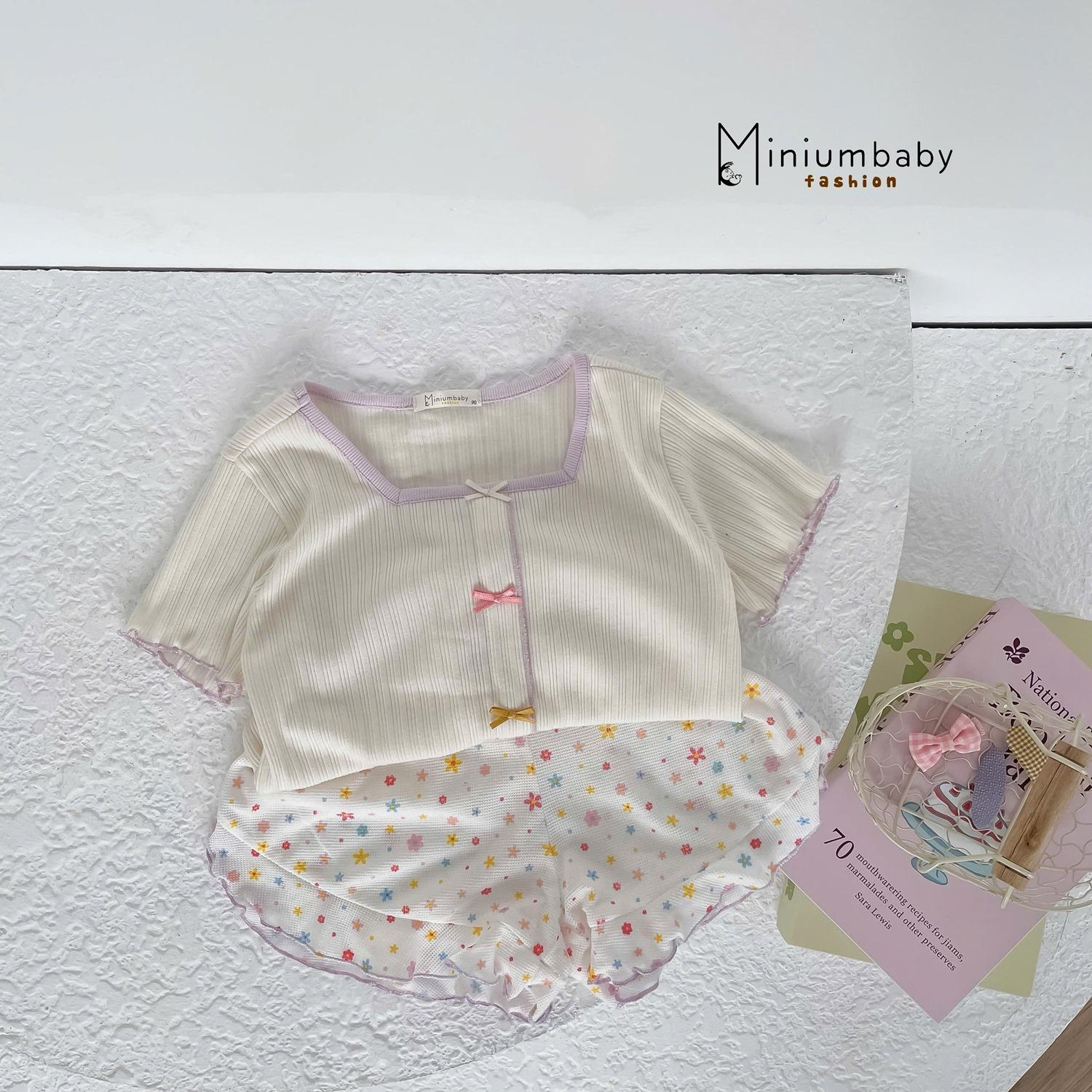 Bộ cộc tay cổ vuông đính nơ nẹp thân trước phối quần hoa