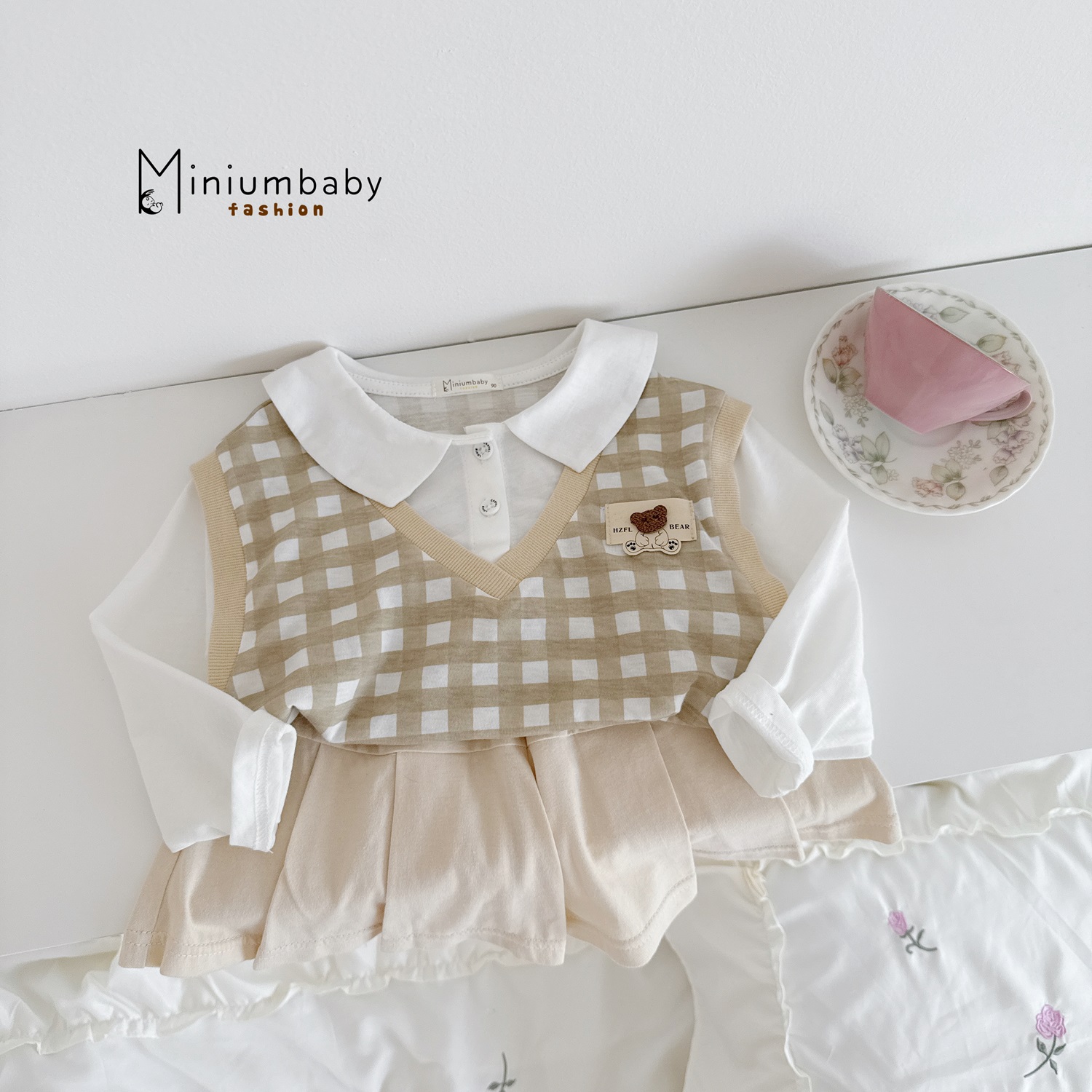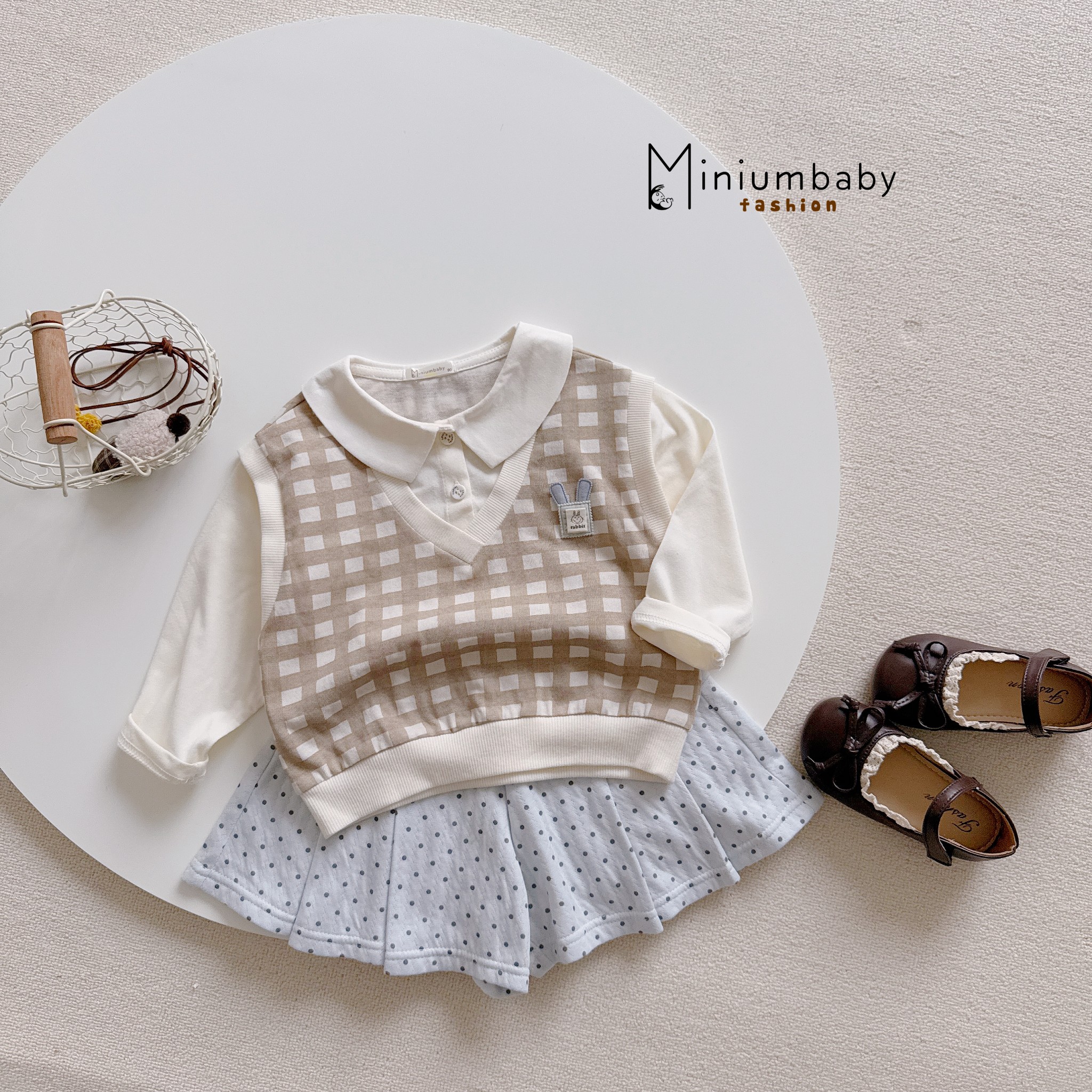 Bộ ghi lê kẻ phối quần váy bi