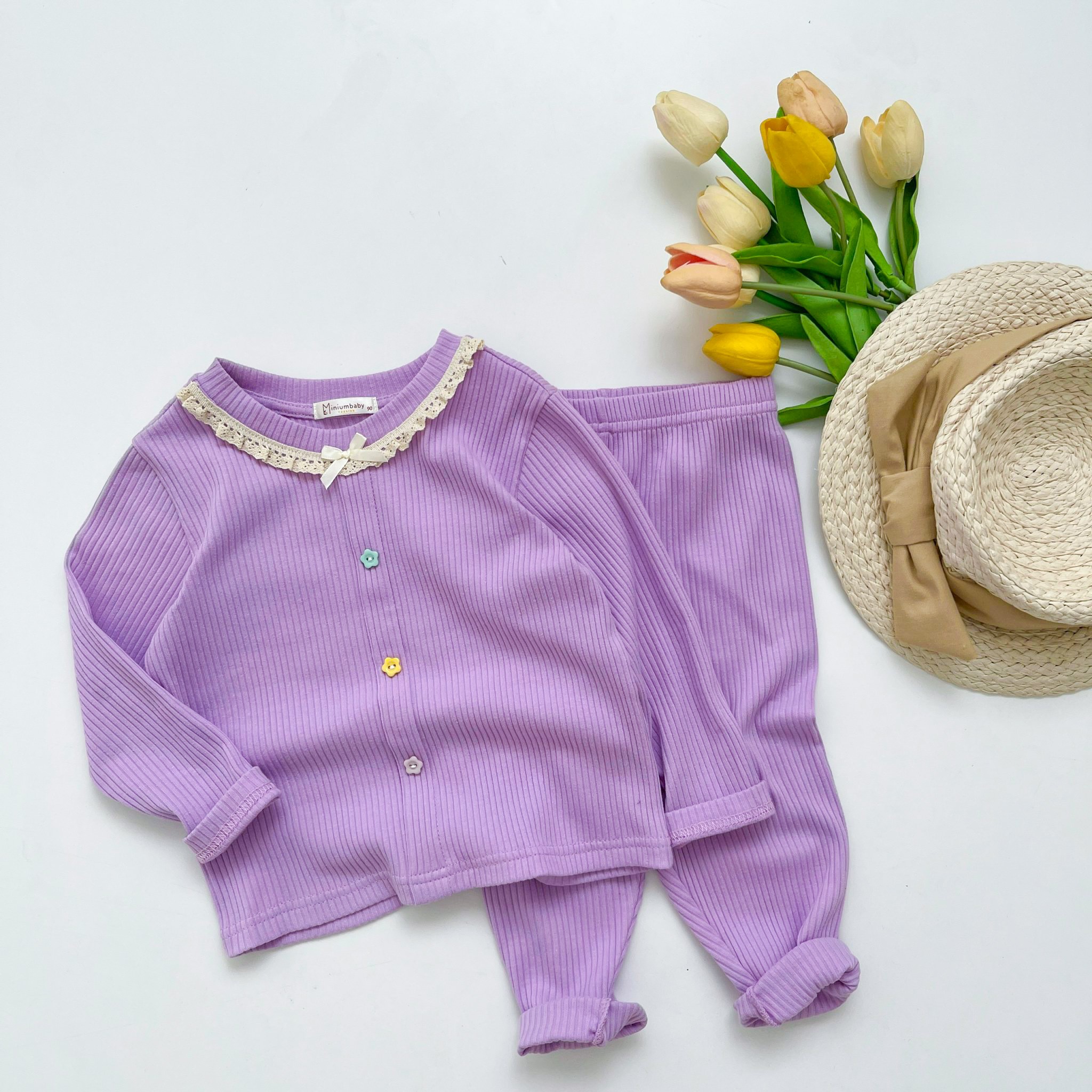 Bộ dài tay cổ bèo đính nơ nẹp thân trước đính cúc hoa màu