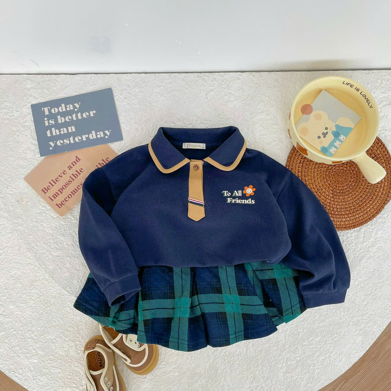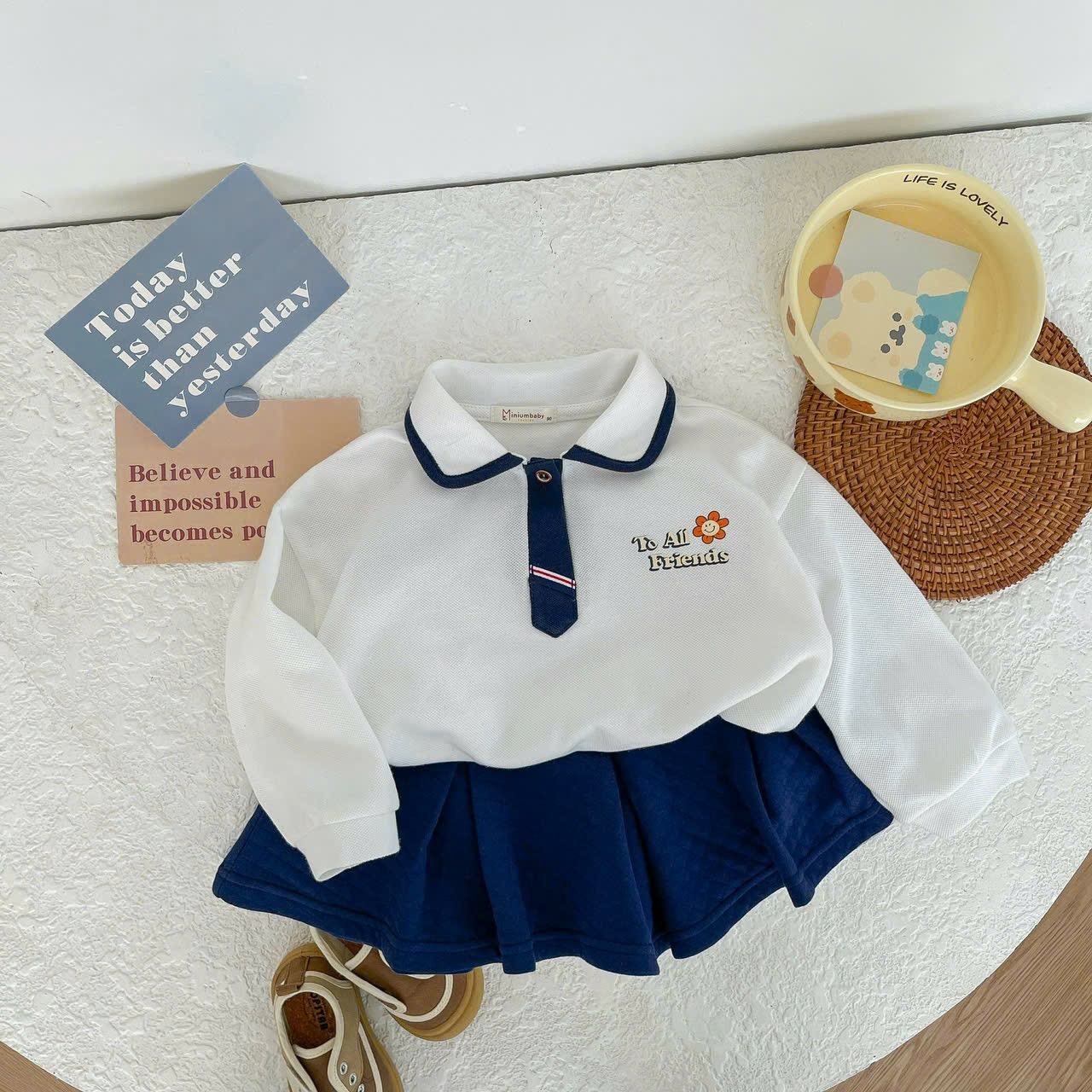Bộ dài tay cà vạt bé gái in hoa, to all friends