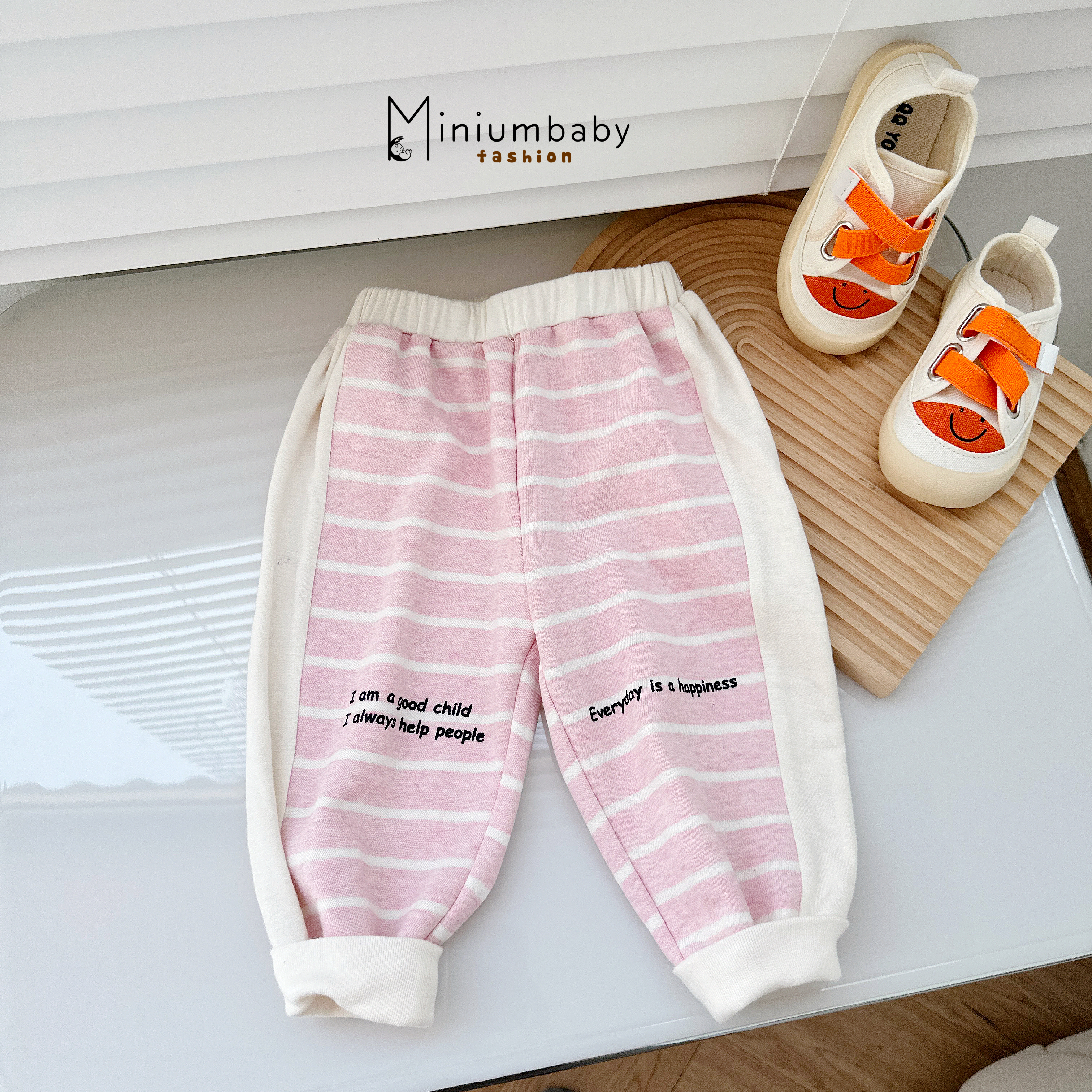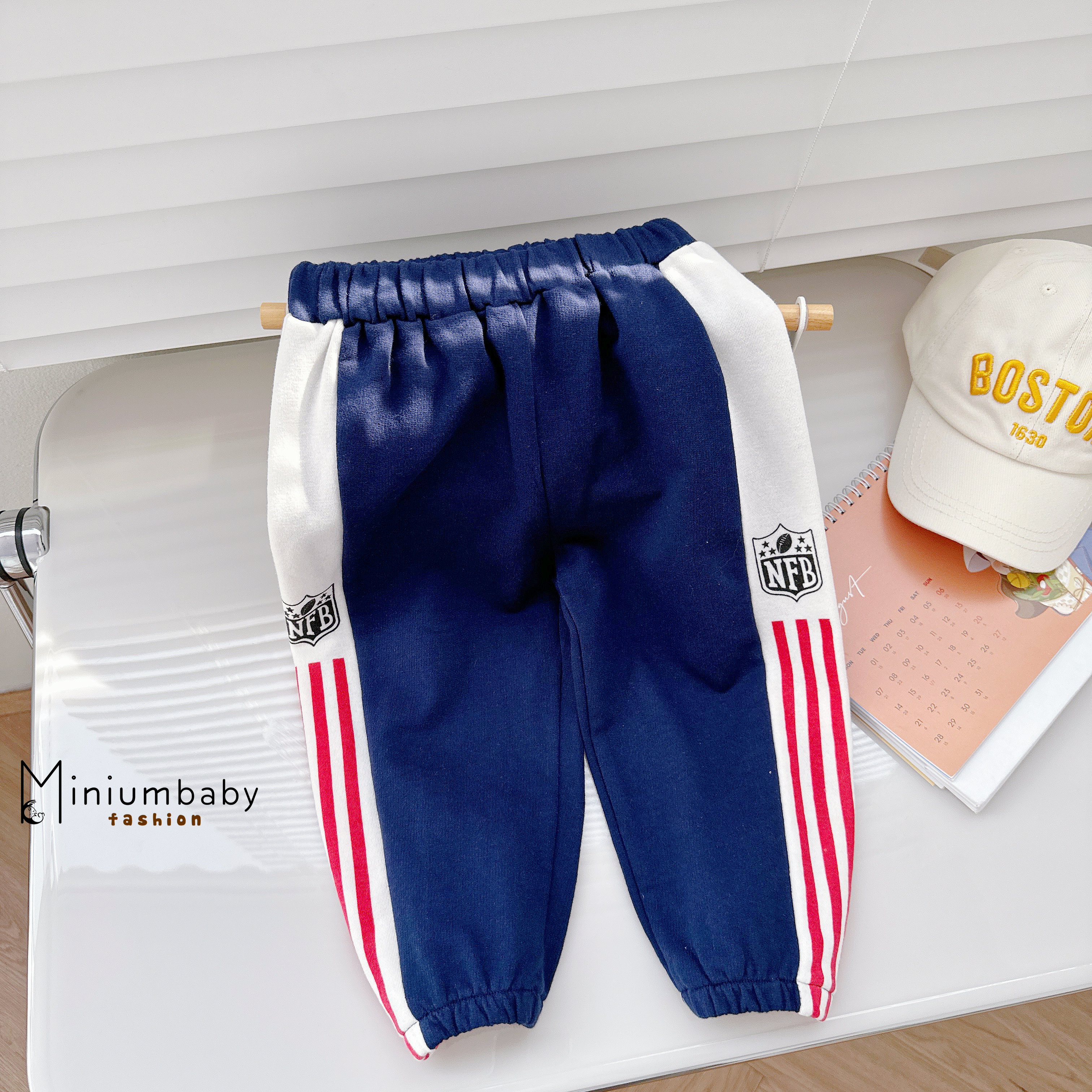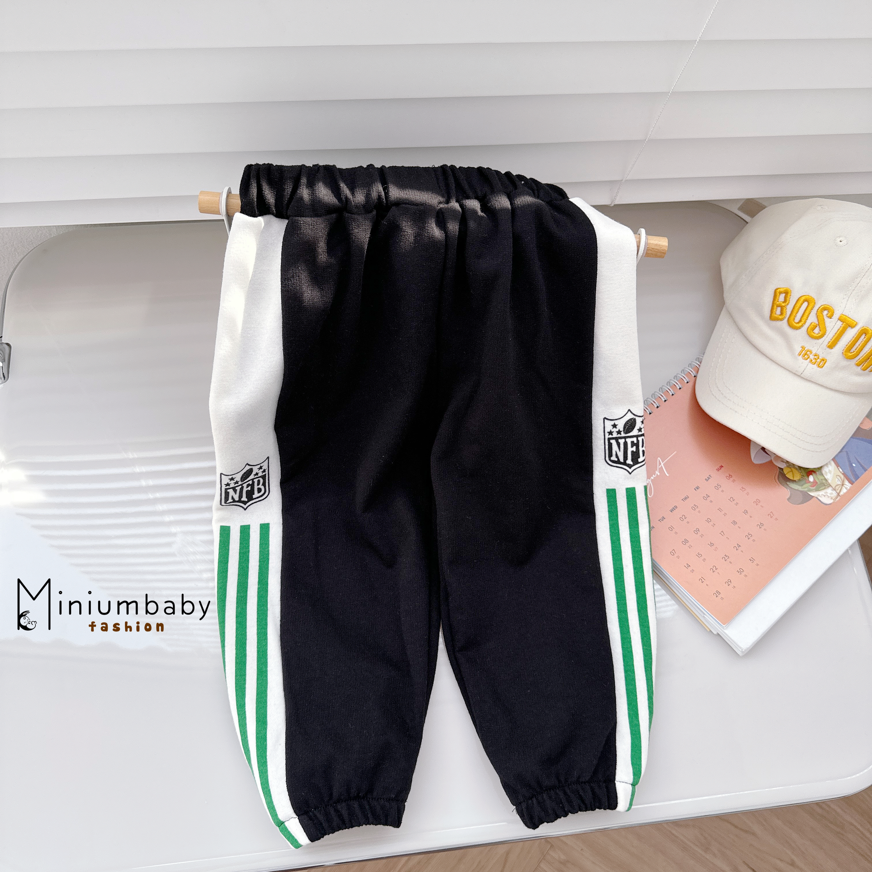 Quần dài phối kẻ in chữ đen thể thao