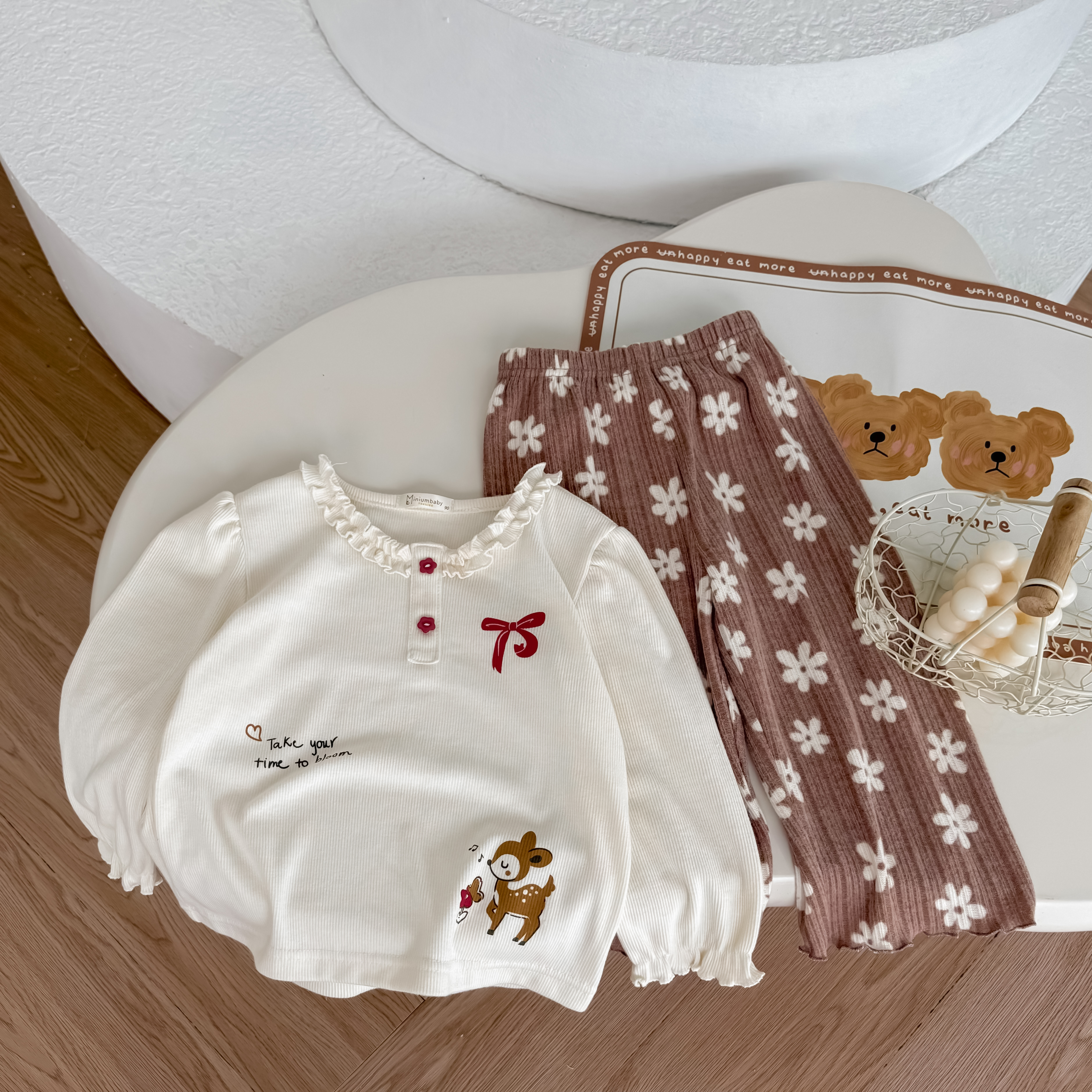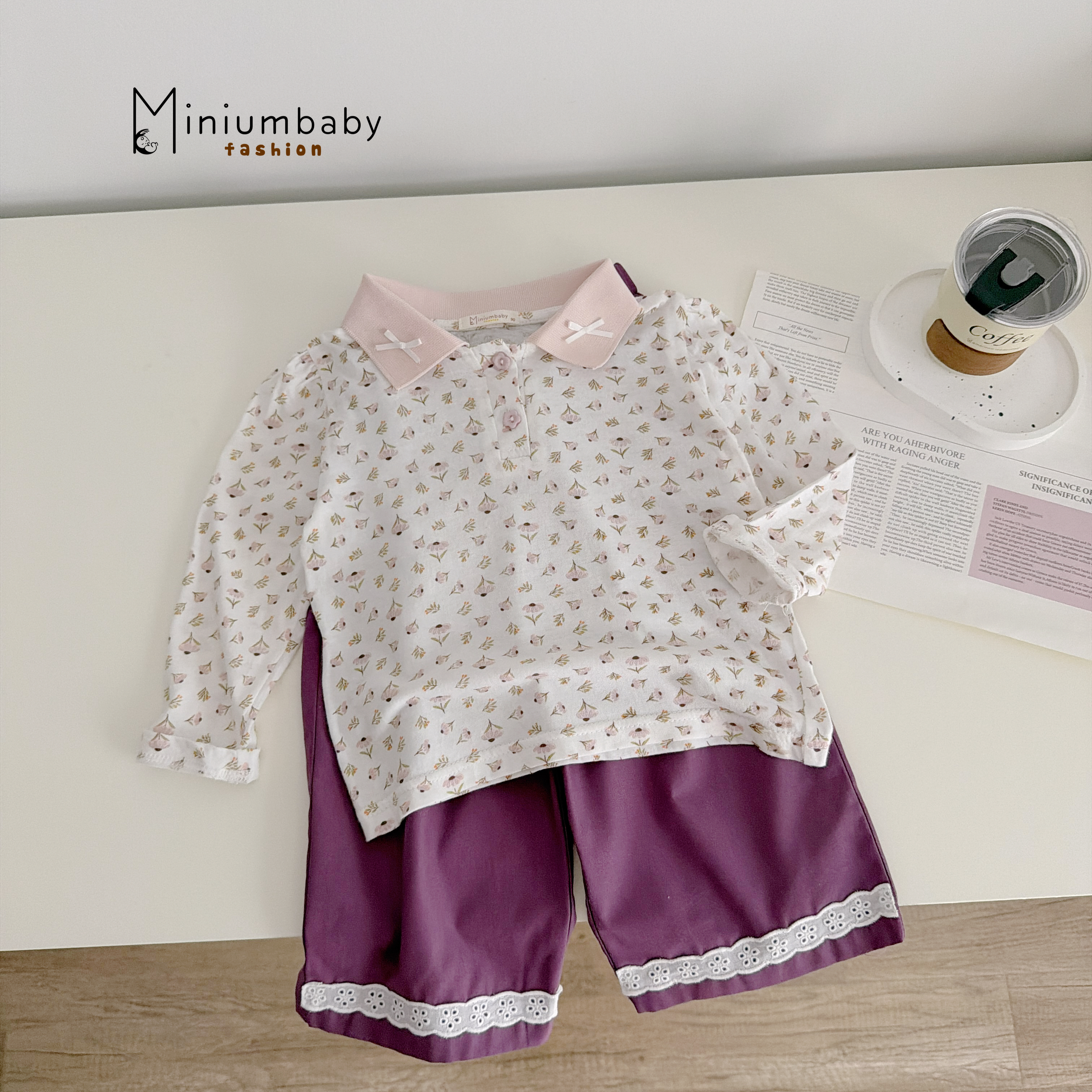 Bộ dài tay hoa phối cổ đính nơ, quần màu đính ren