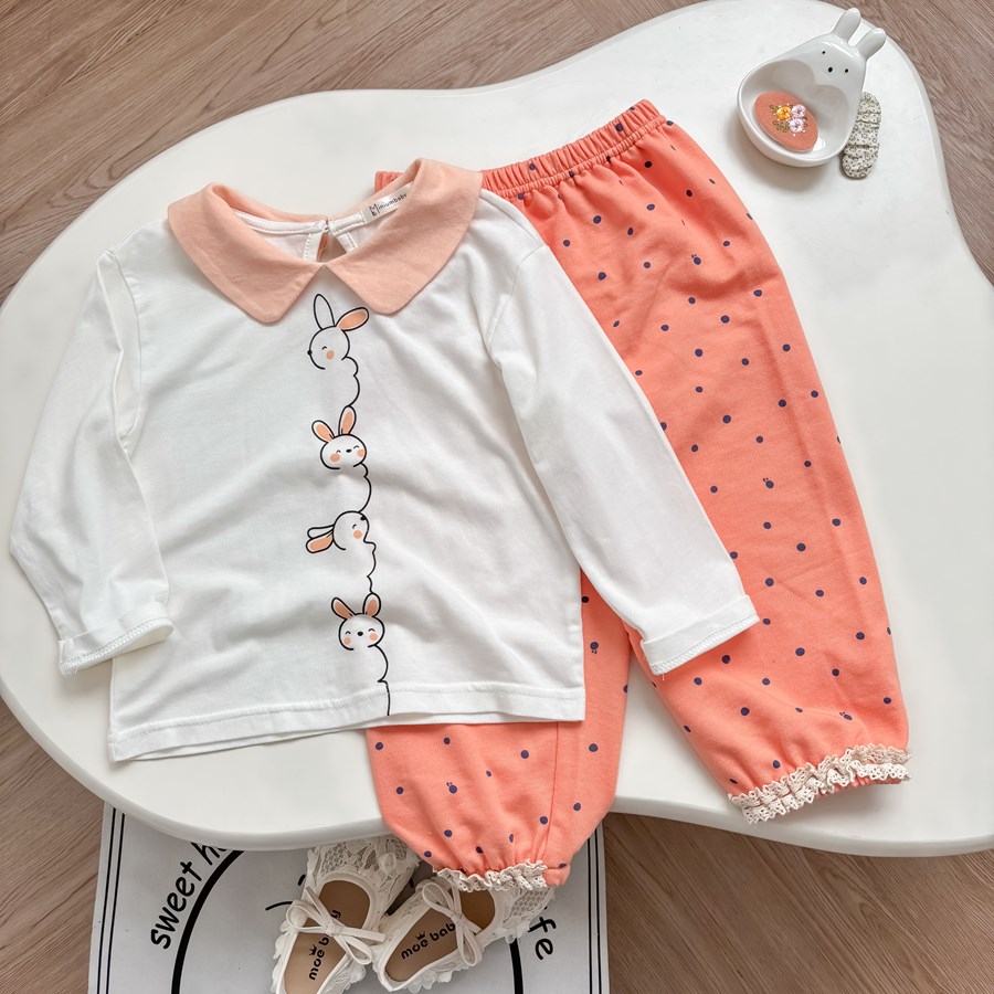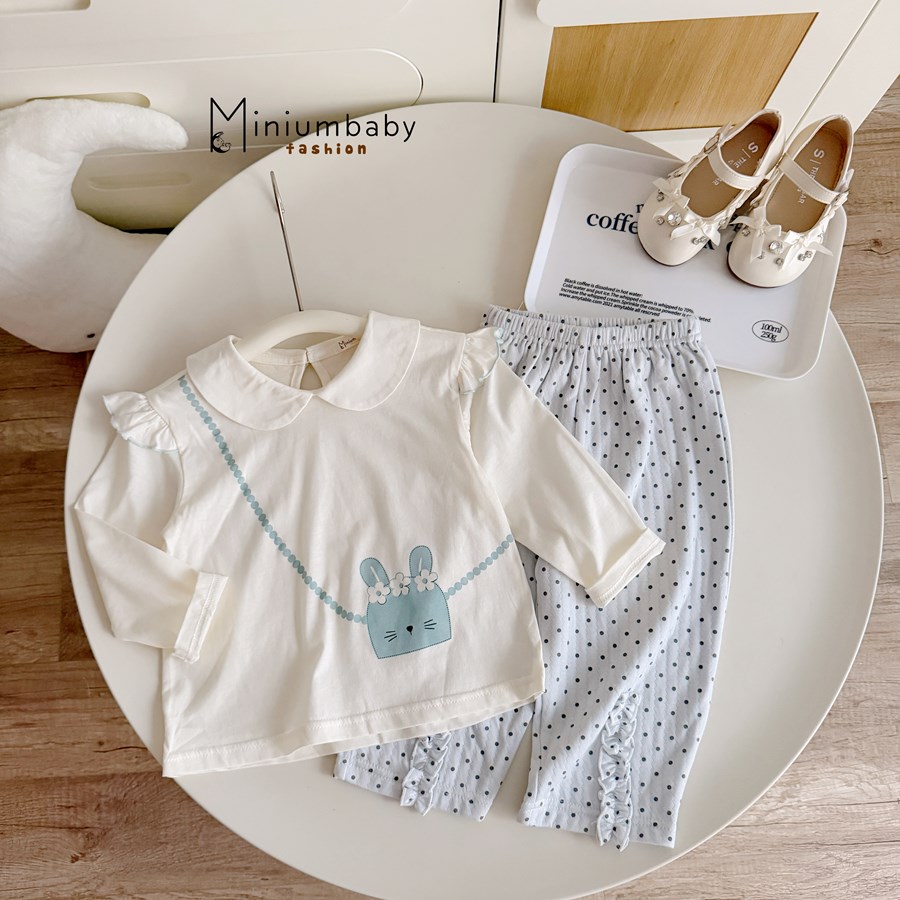 Bbộ dài tay cổ sen bé gái in túi thỏ
