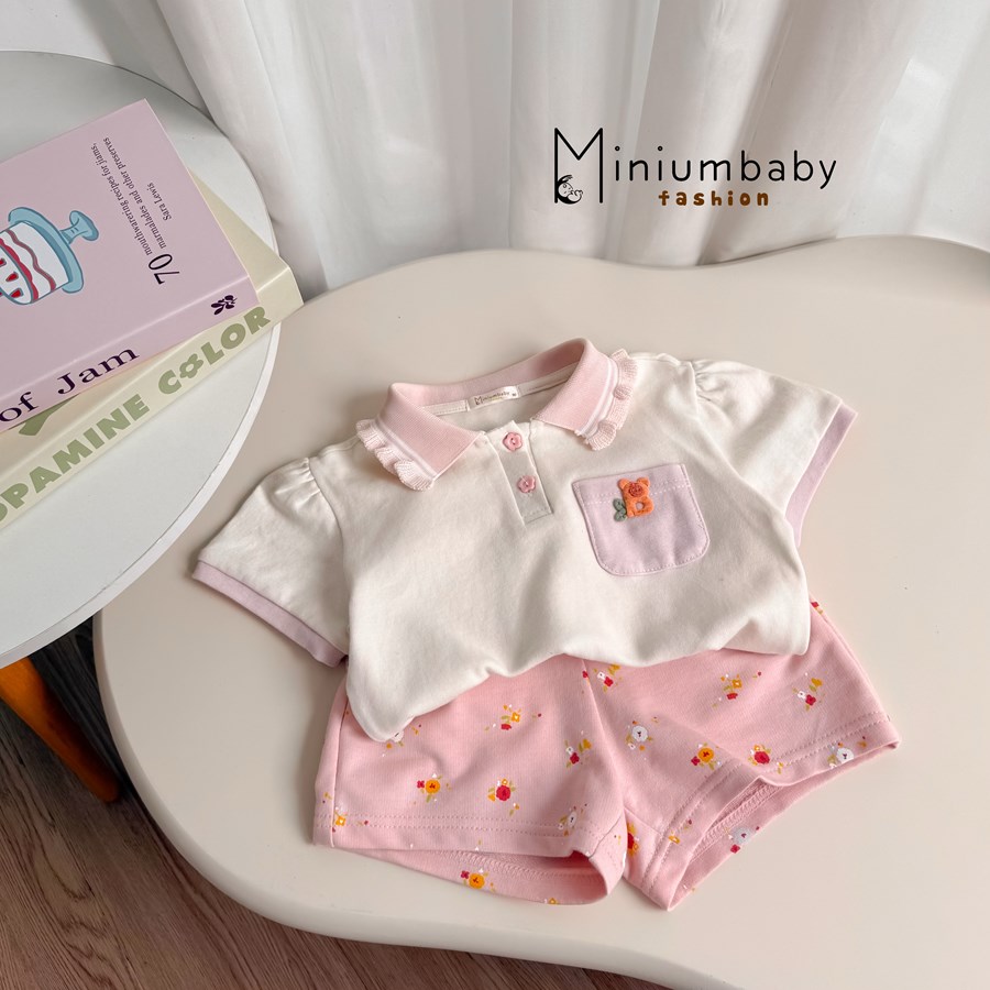 Bộ cộc tay bé gái cổ zen, in họa tiết thân trước, quần phối beò gấu