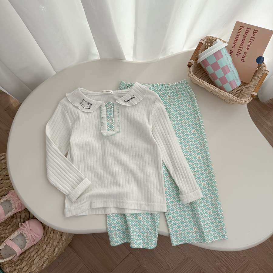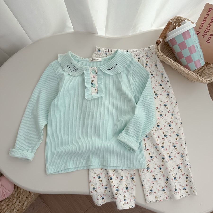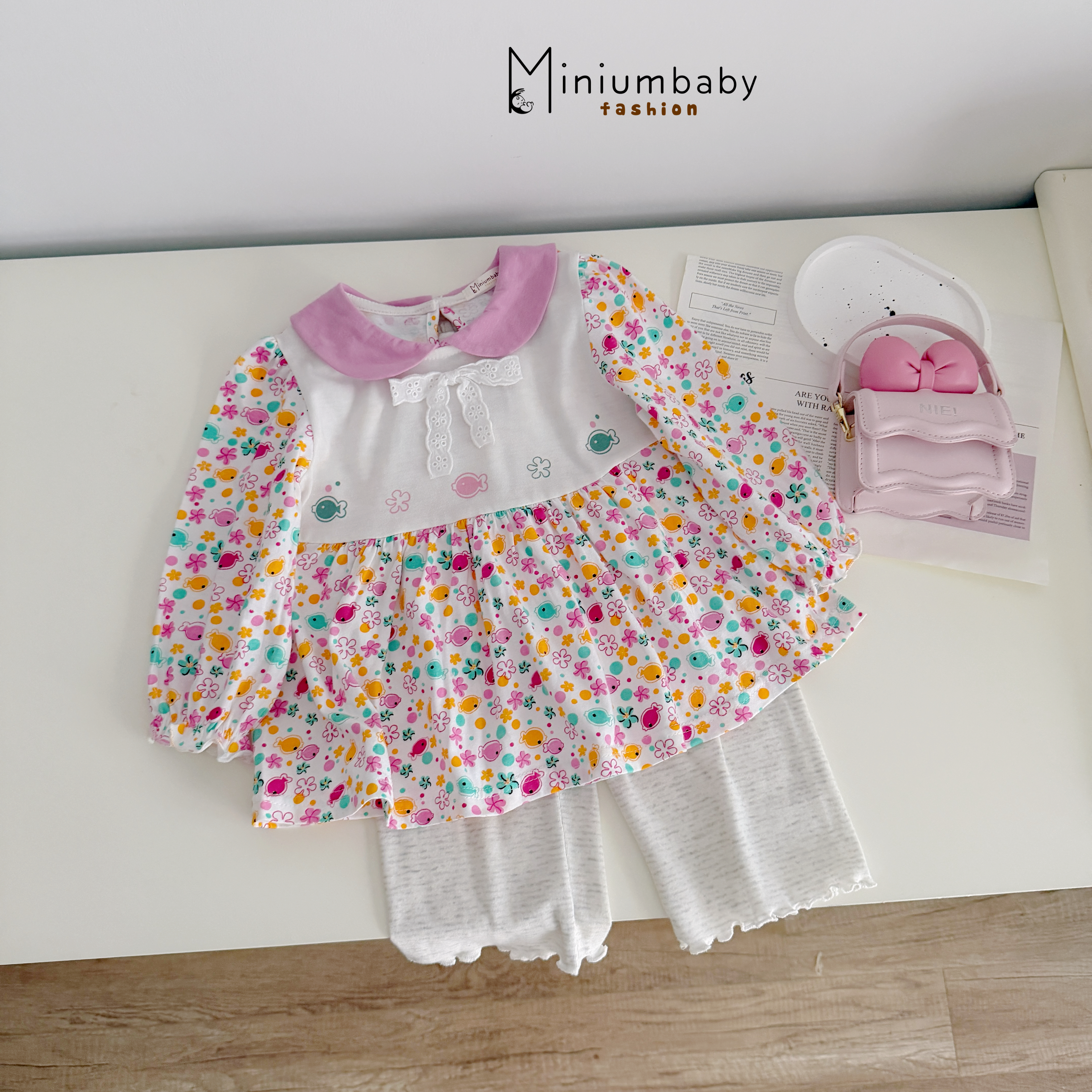 Bộ dài tay babydoll bé gái phối cổ in họa tiết phối quần trơn
