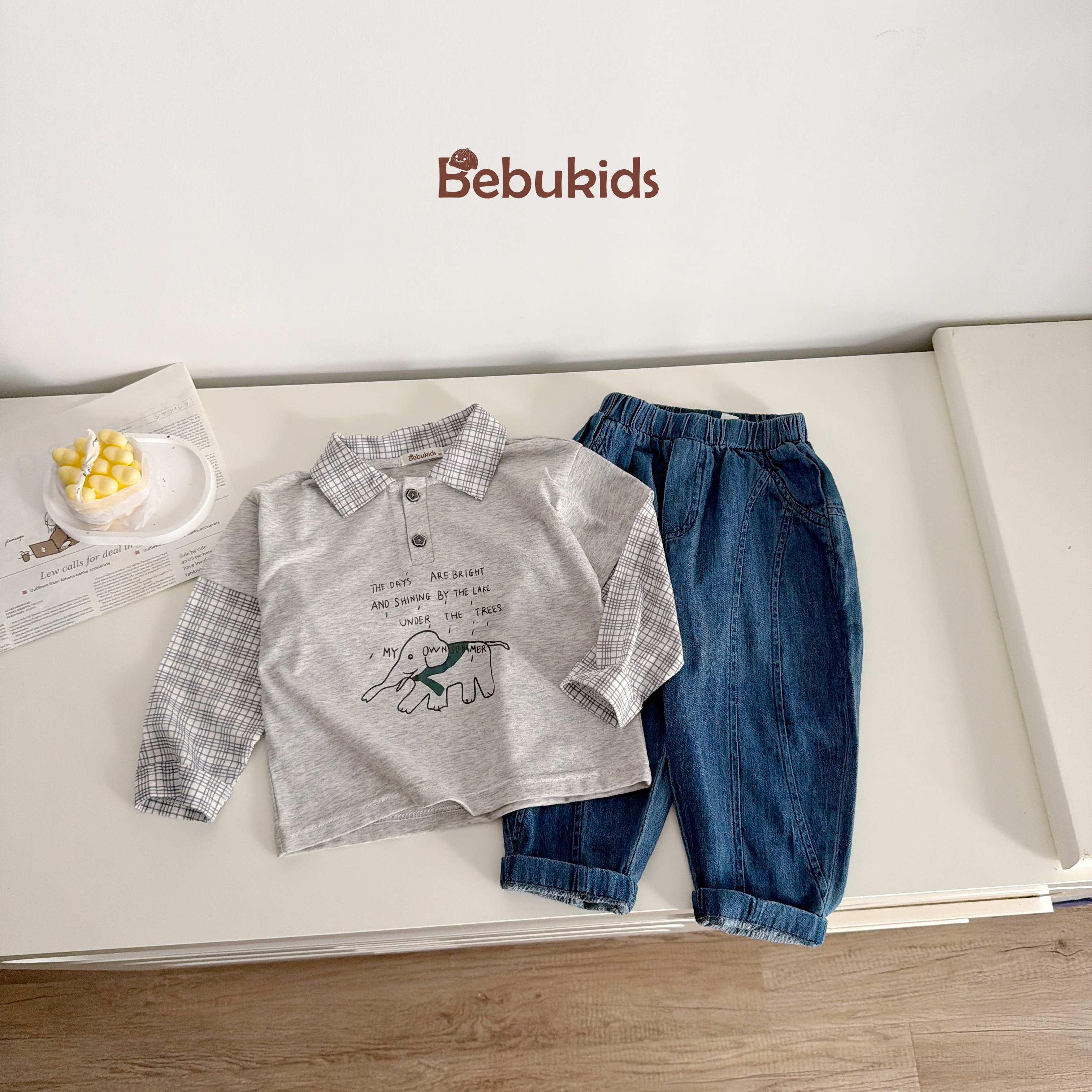 Bộ dài tay bé trai phối cổ kẻ in cún, ôto xanh, quần bò