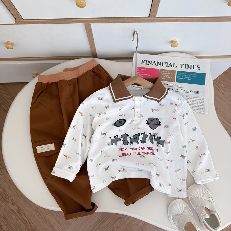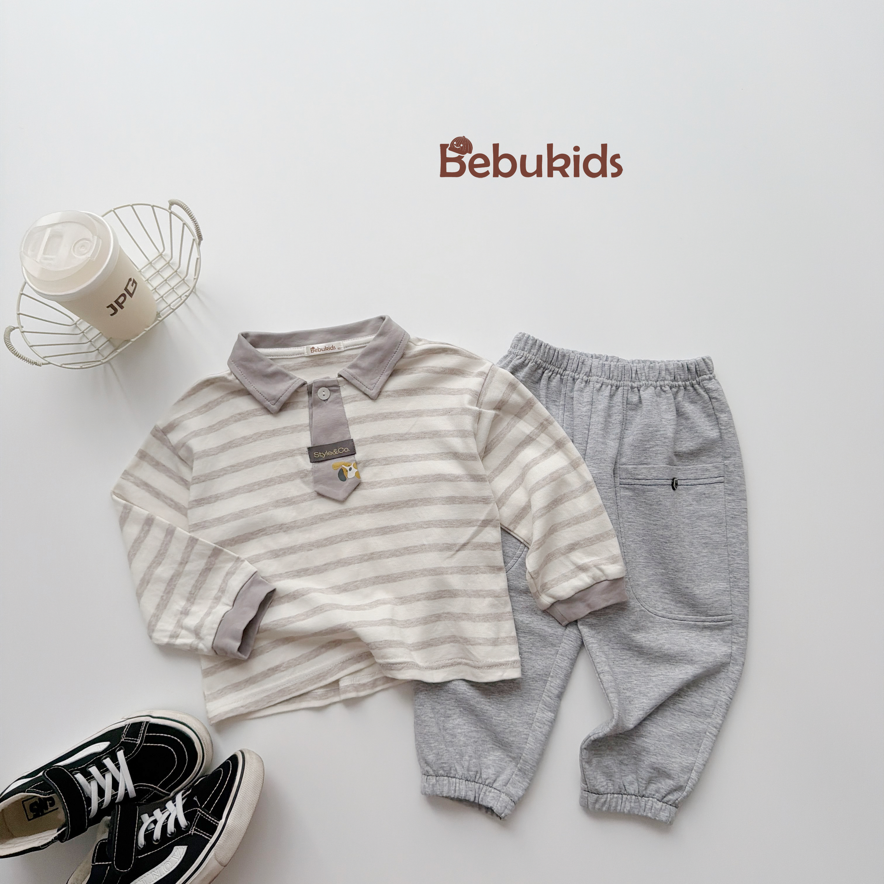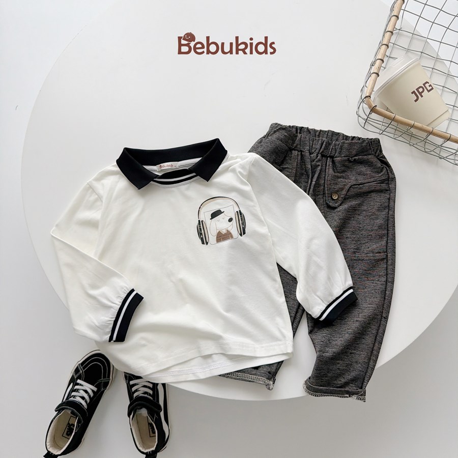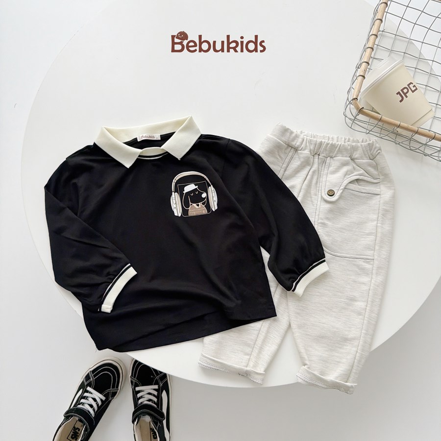 Bộ polo dài tay bé trai cổ phối 1 sọc, áo in chữ B, 6 chú cún
