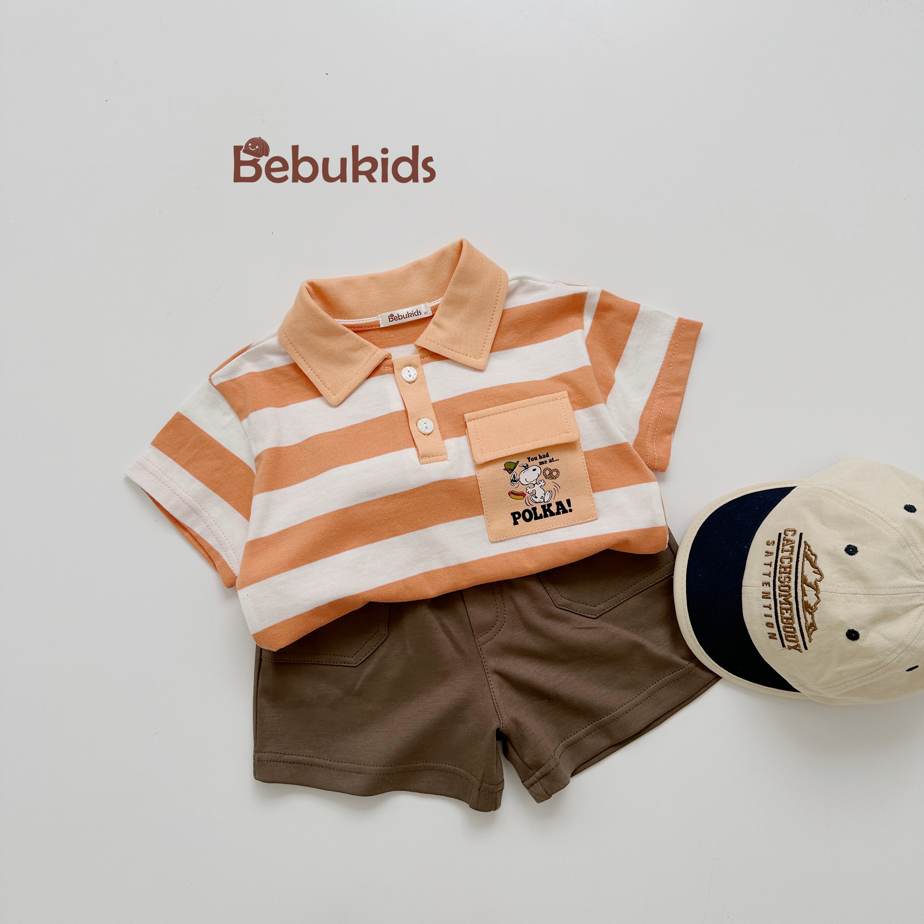 Bộ polo sọc ngang túi ngực in chó polka