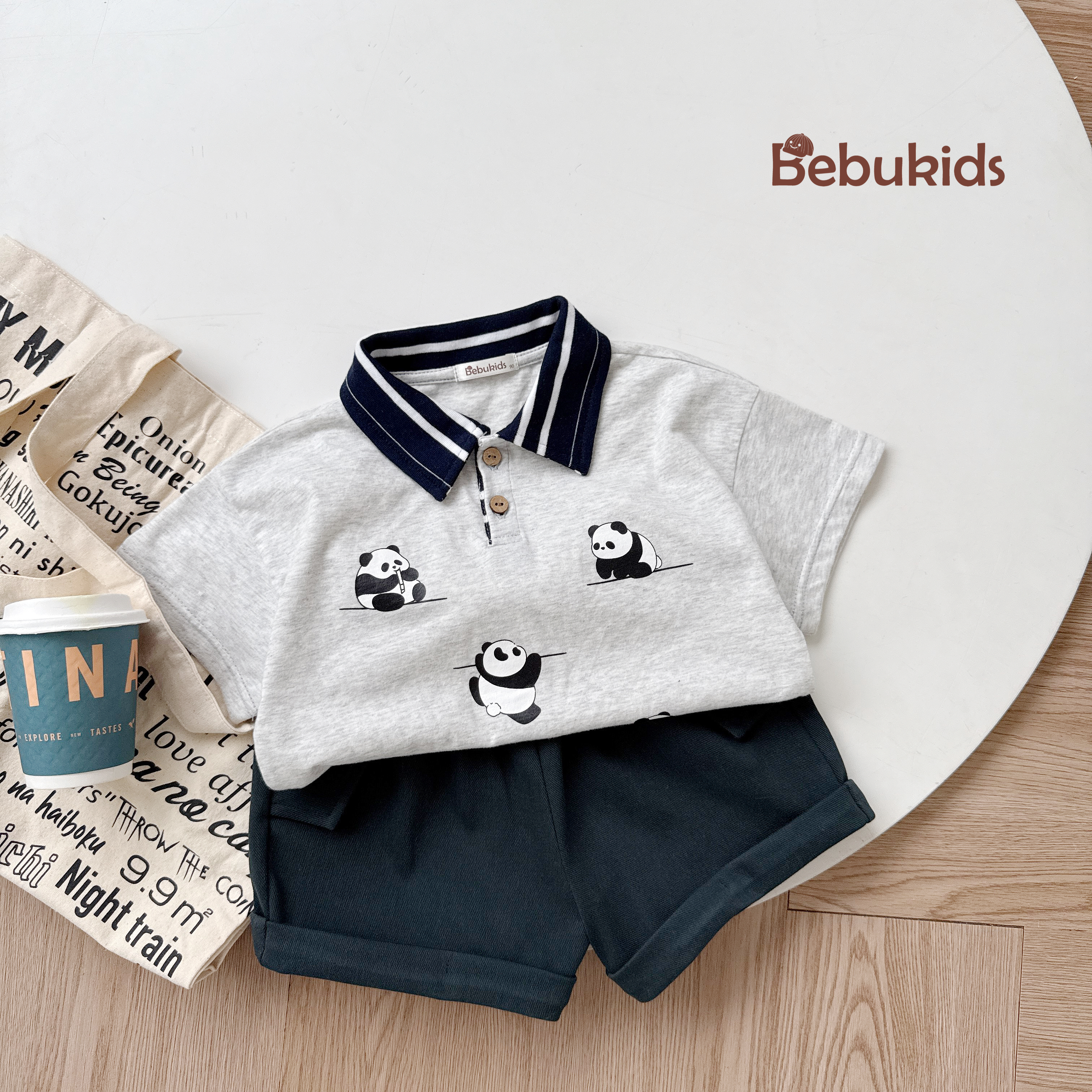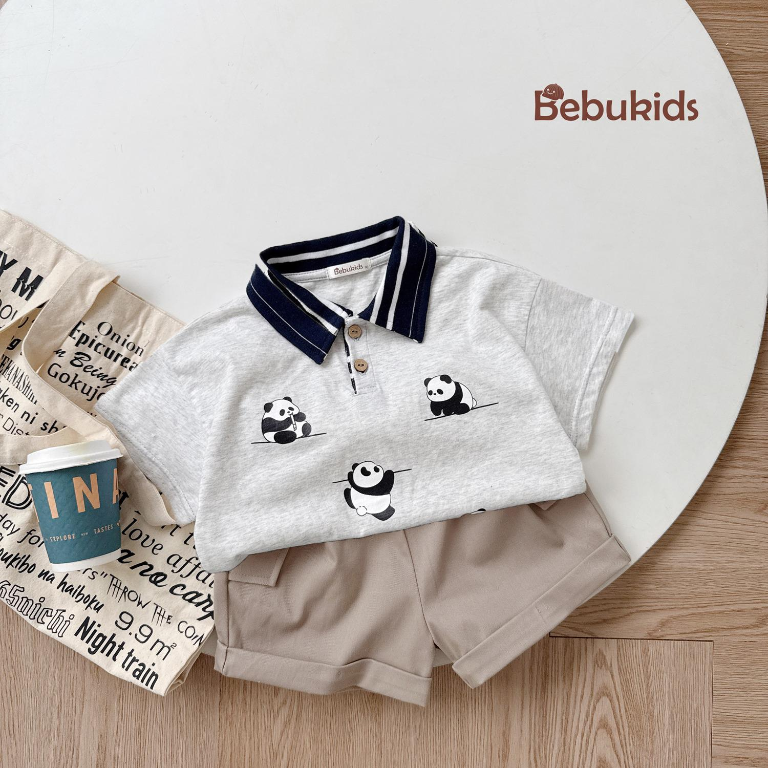 Bộ polo cộc cổ kẻ in gấu trúc