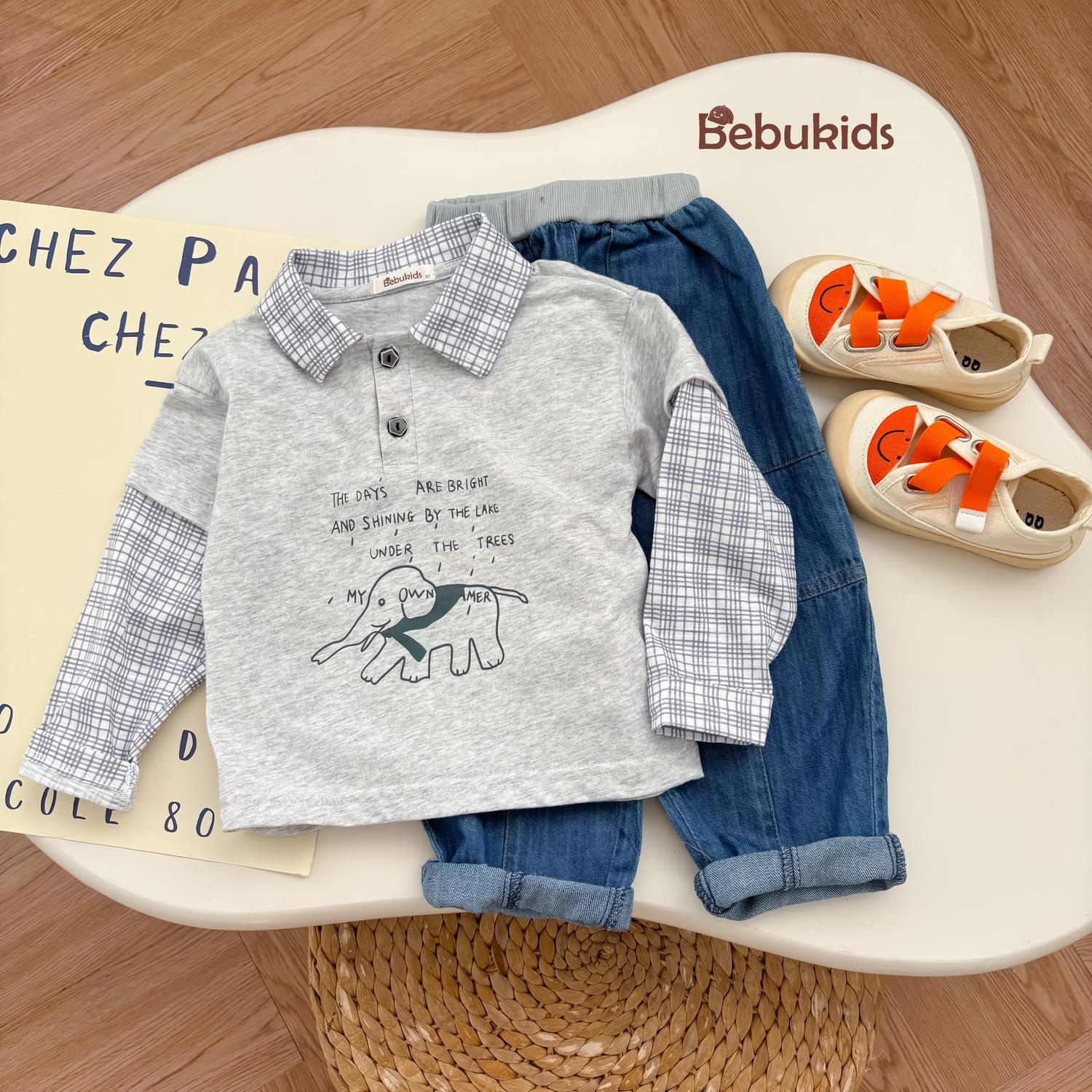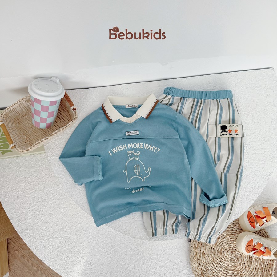 Bộ dài tay bé trai phối cổ, tay kẻ in voi,chữ