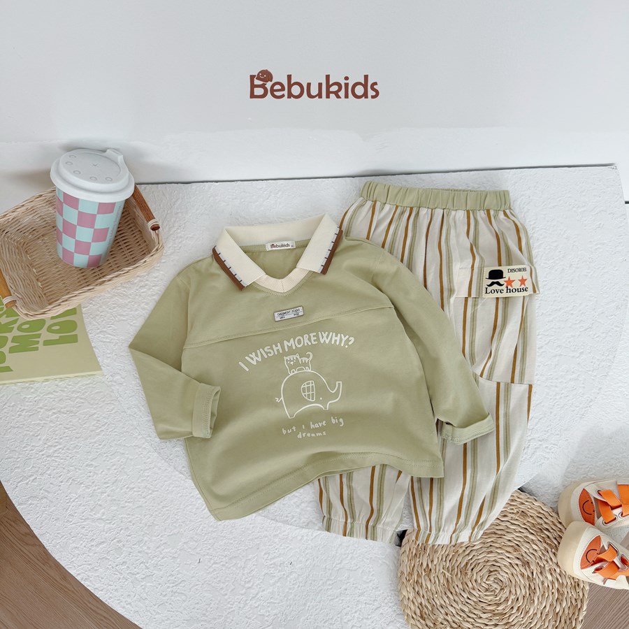 Bộ dài tay bé trai in voi, i whish more why phối quần sọc kẻ