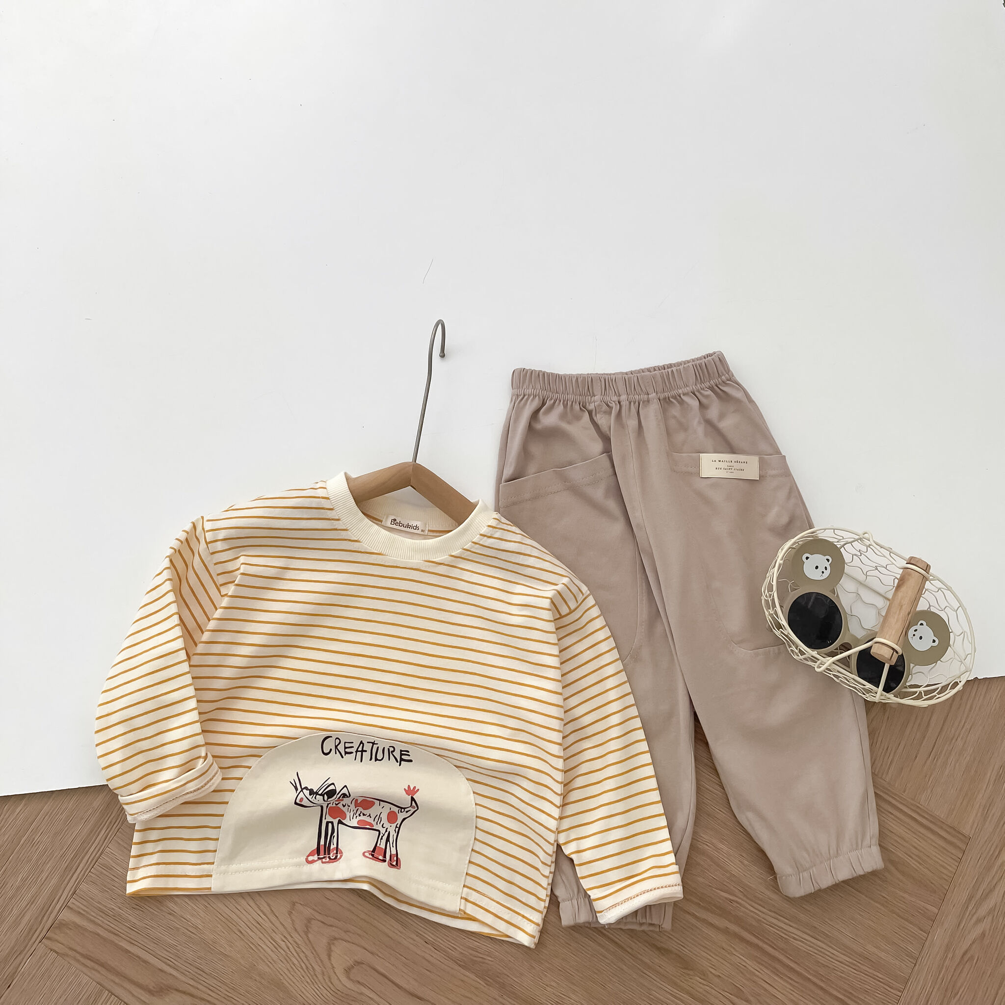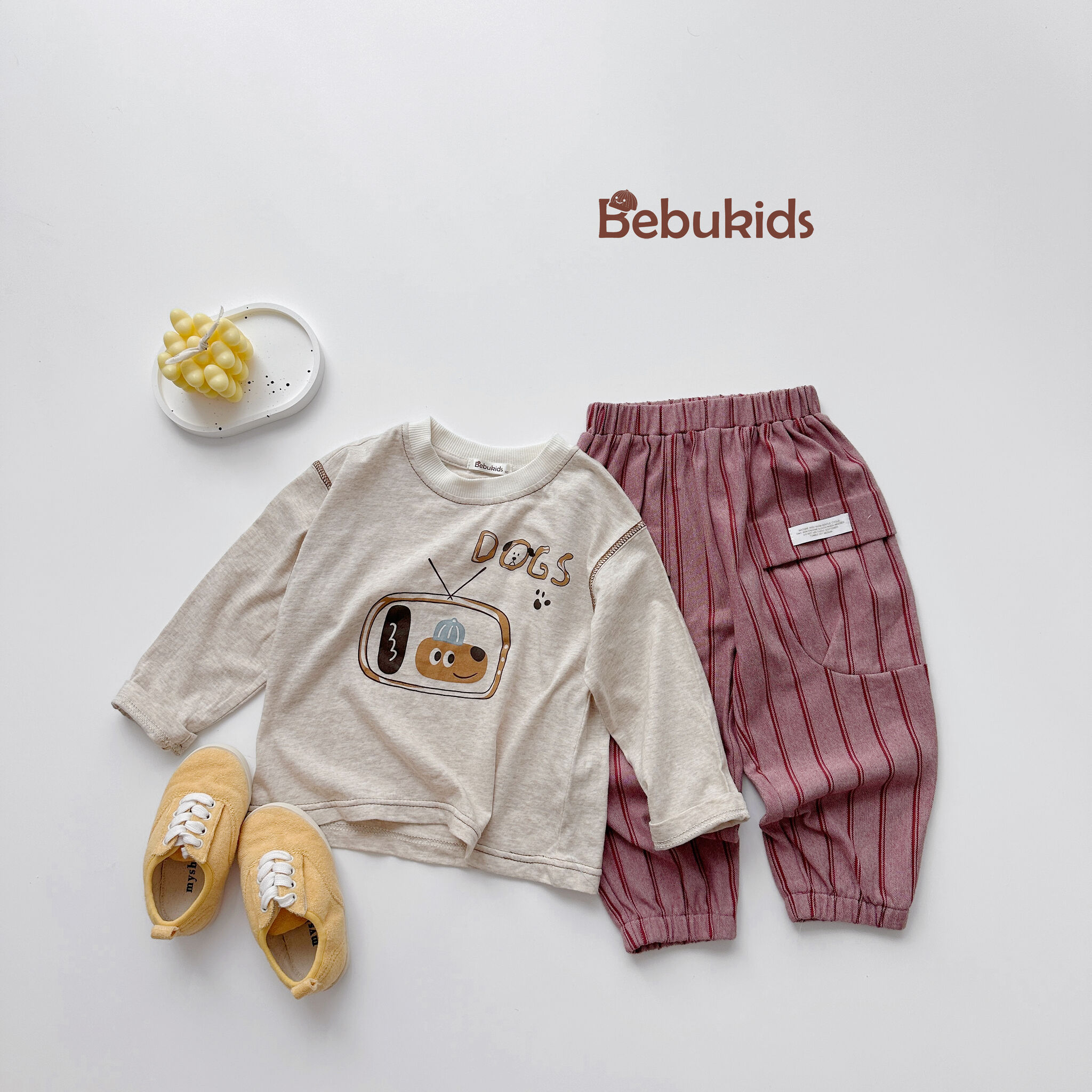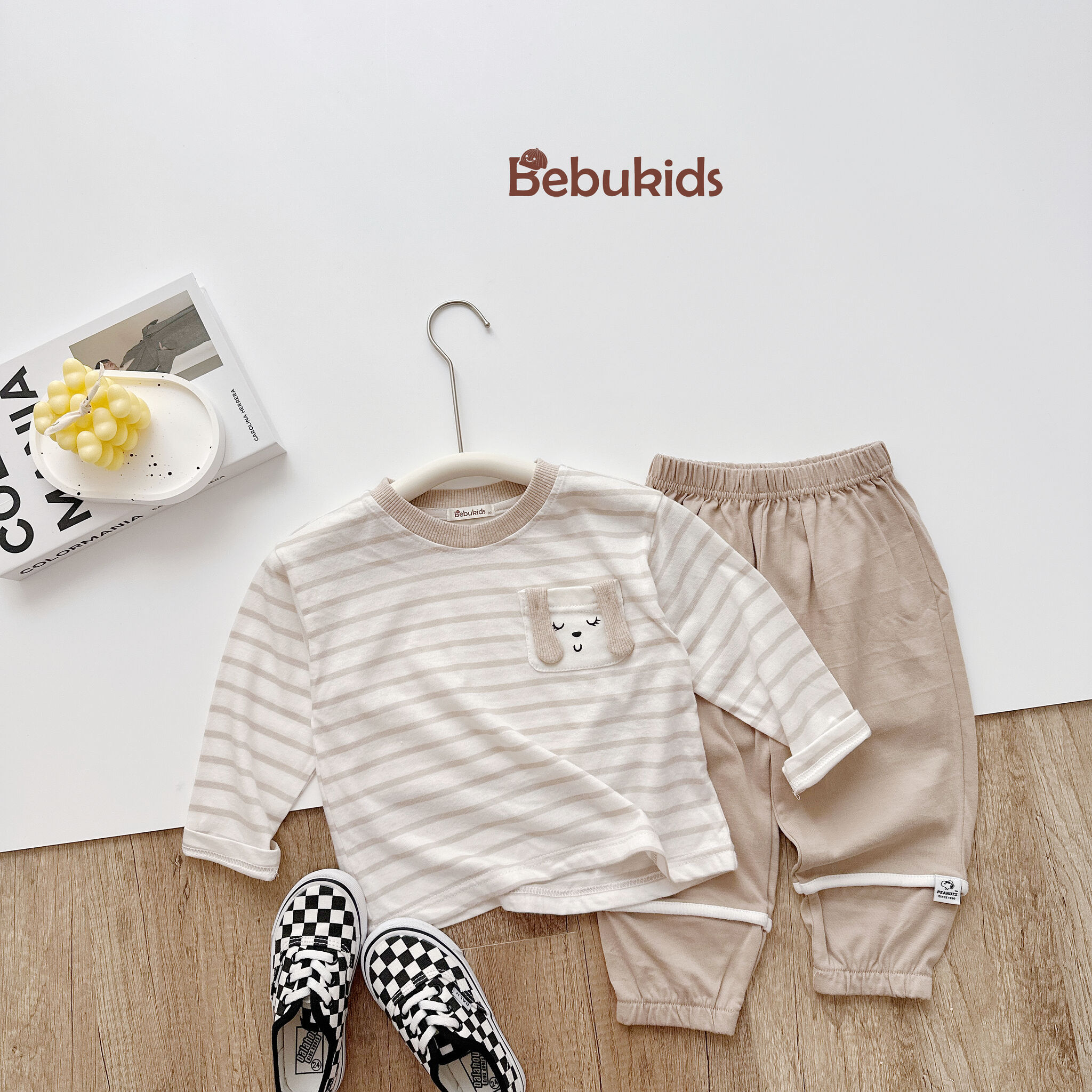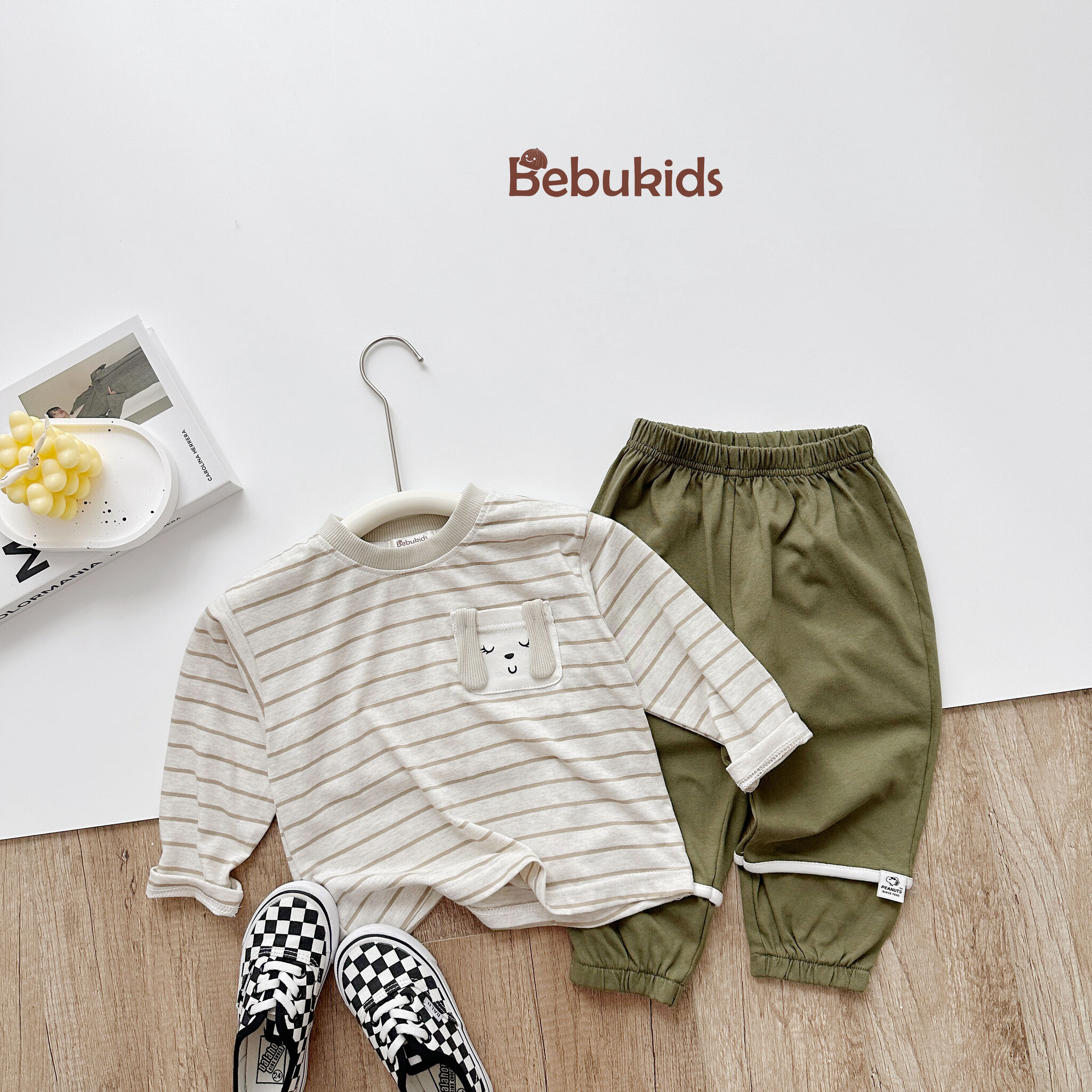 Bộ bé trai dài tay kẻ ngang túi ngực in cún đính tai