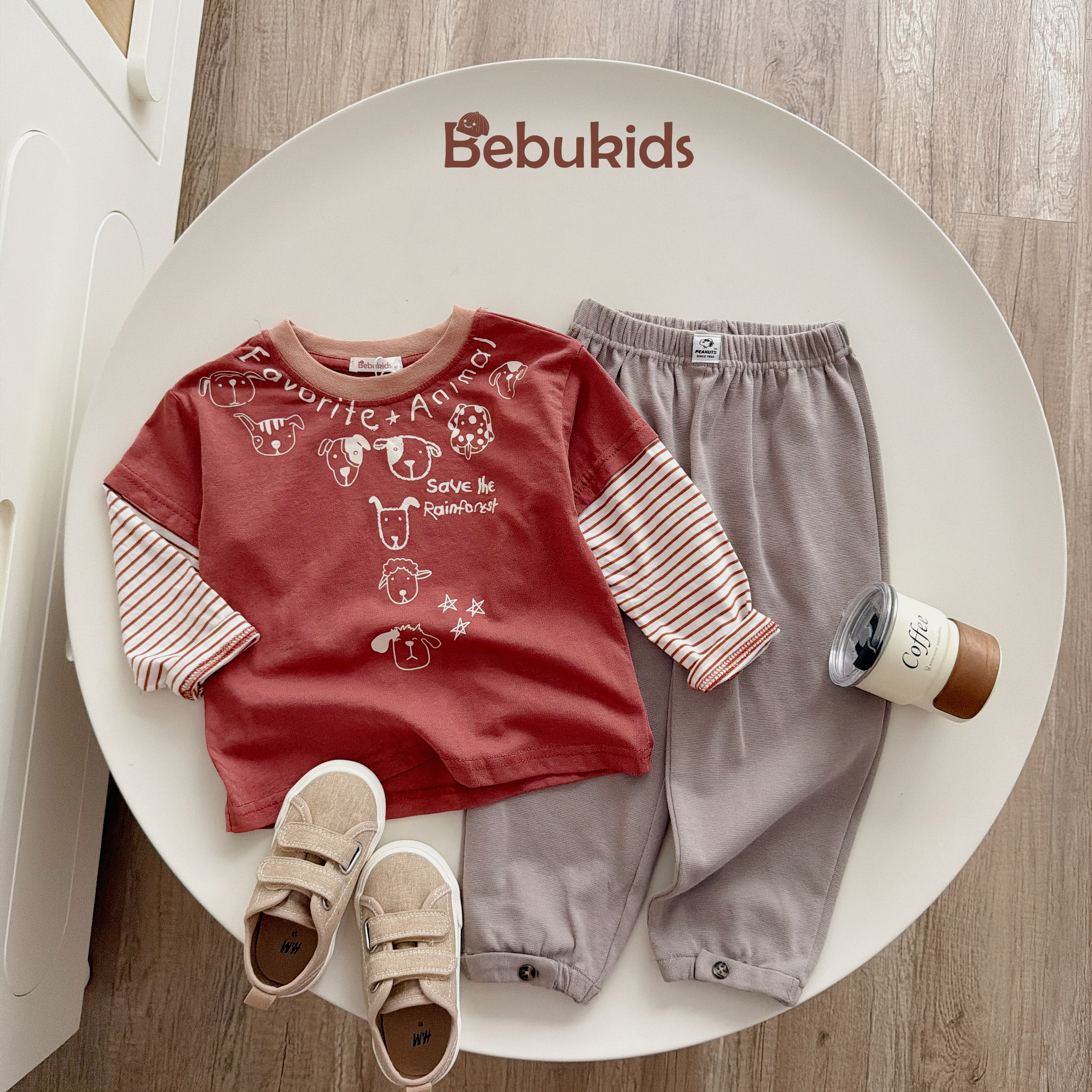 Bộ dài tay in thú phối quàn diễu chỉ nổi túi đính cúc gấu bo chun