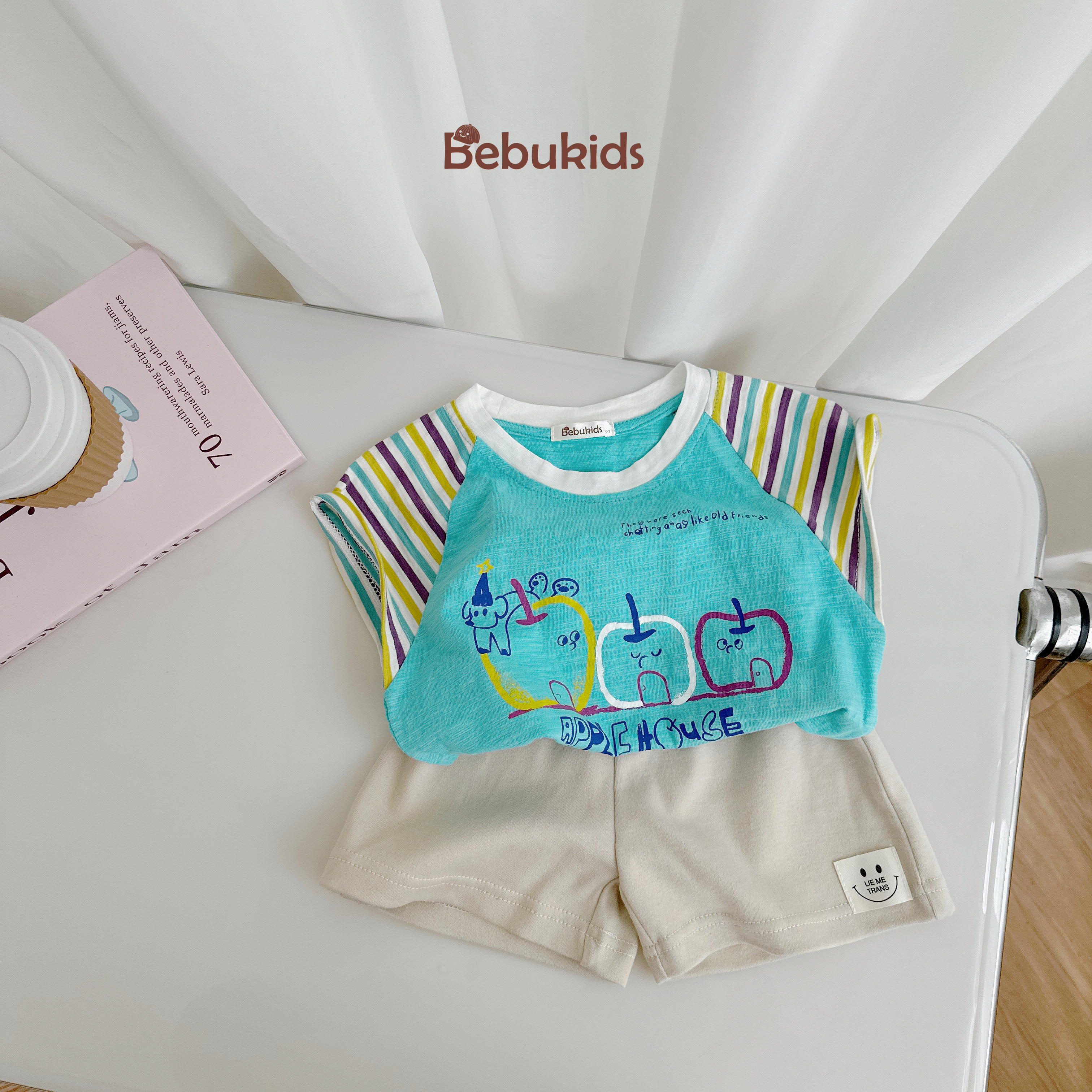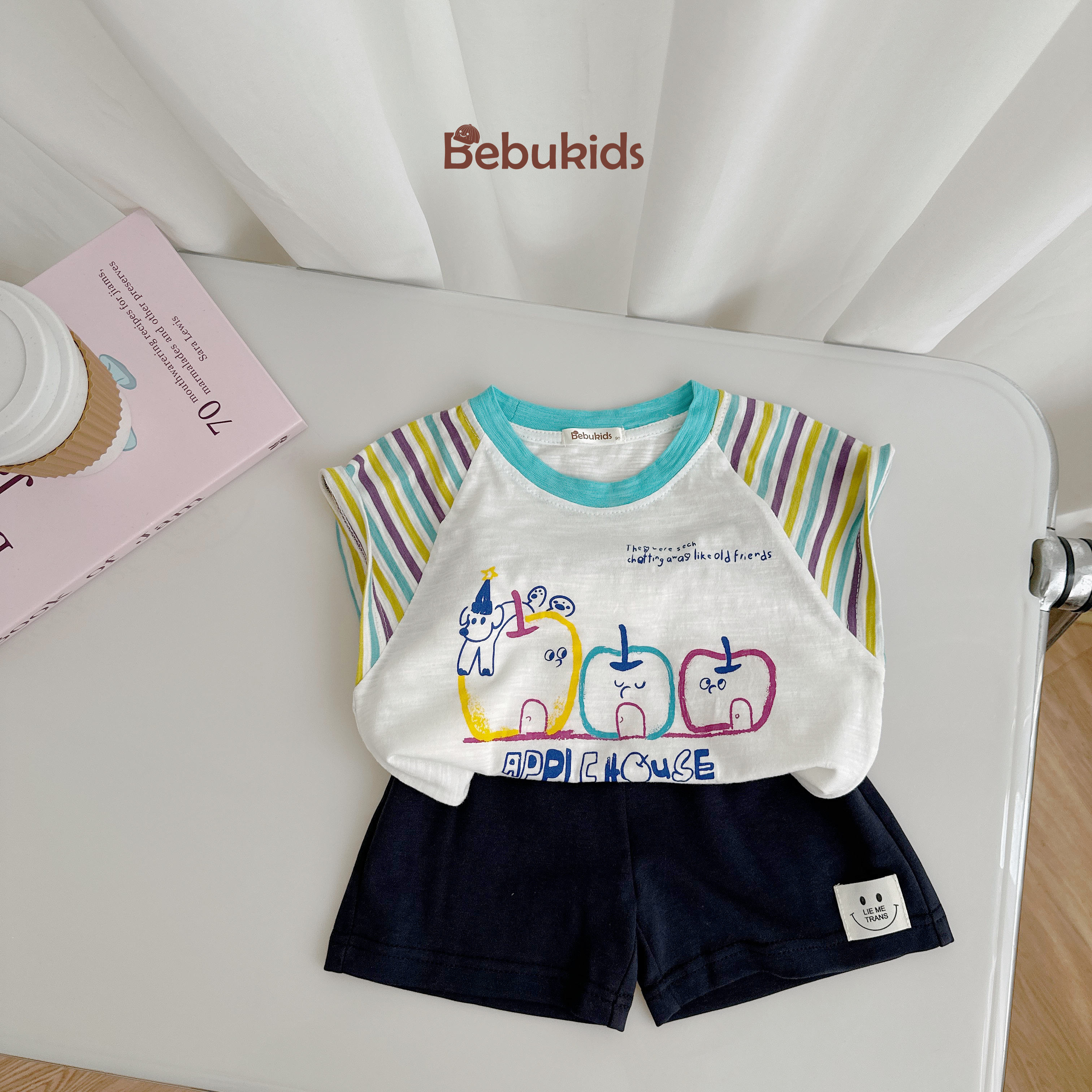 Bộ cộc tay phối tay kẻ, thân in 3 quả táo,...