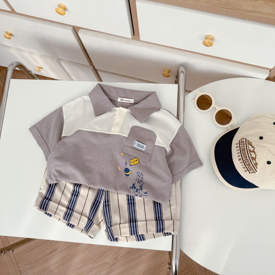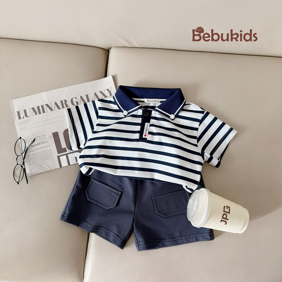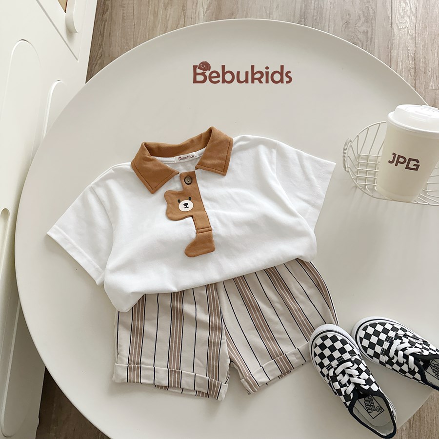 SB2541-Bộ polo kẻ ngang bé trai cổ đính cúc gấu