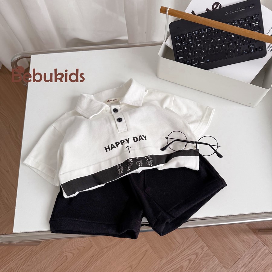 Bộ polo bé trai phối viền kẻ in họa tiết, chữ you must be happy to