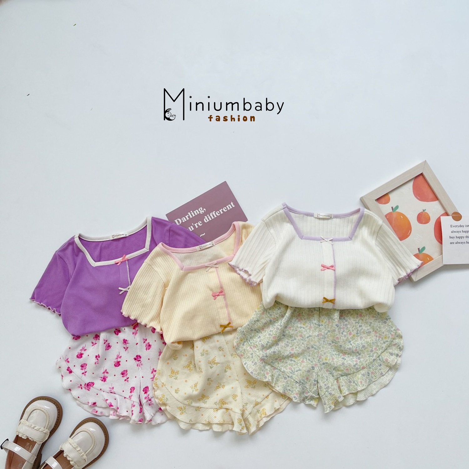 SB1983-bộ cộc tay cổ vuông đính nơ nẹp thân trước phối quần hoa