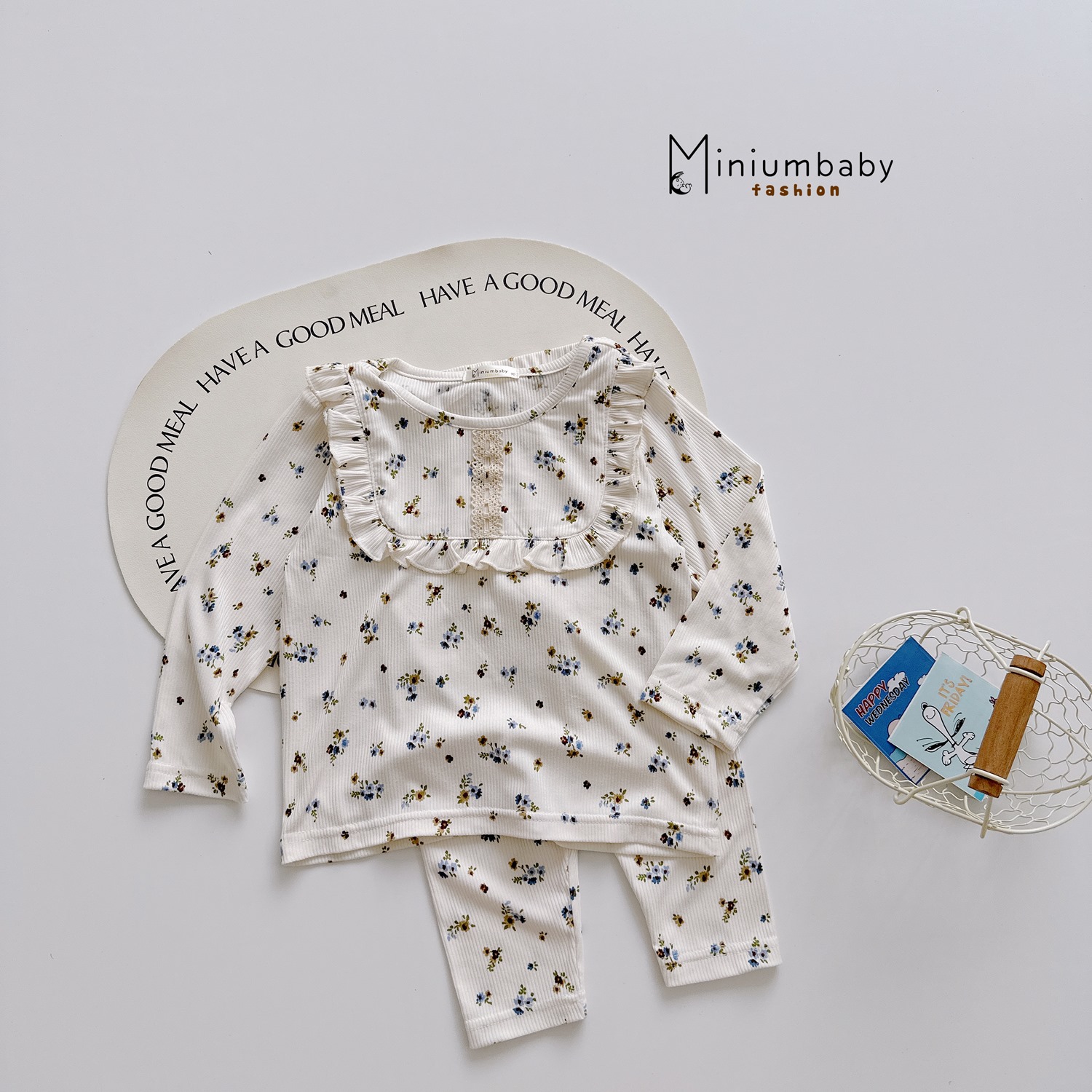 SB2197- bộ dài tay chấm bi bèo vai đính hoa ngực