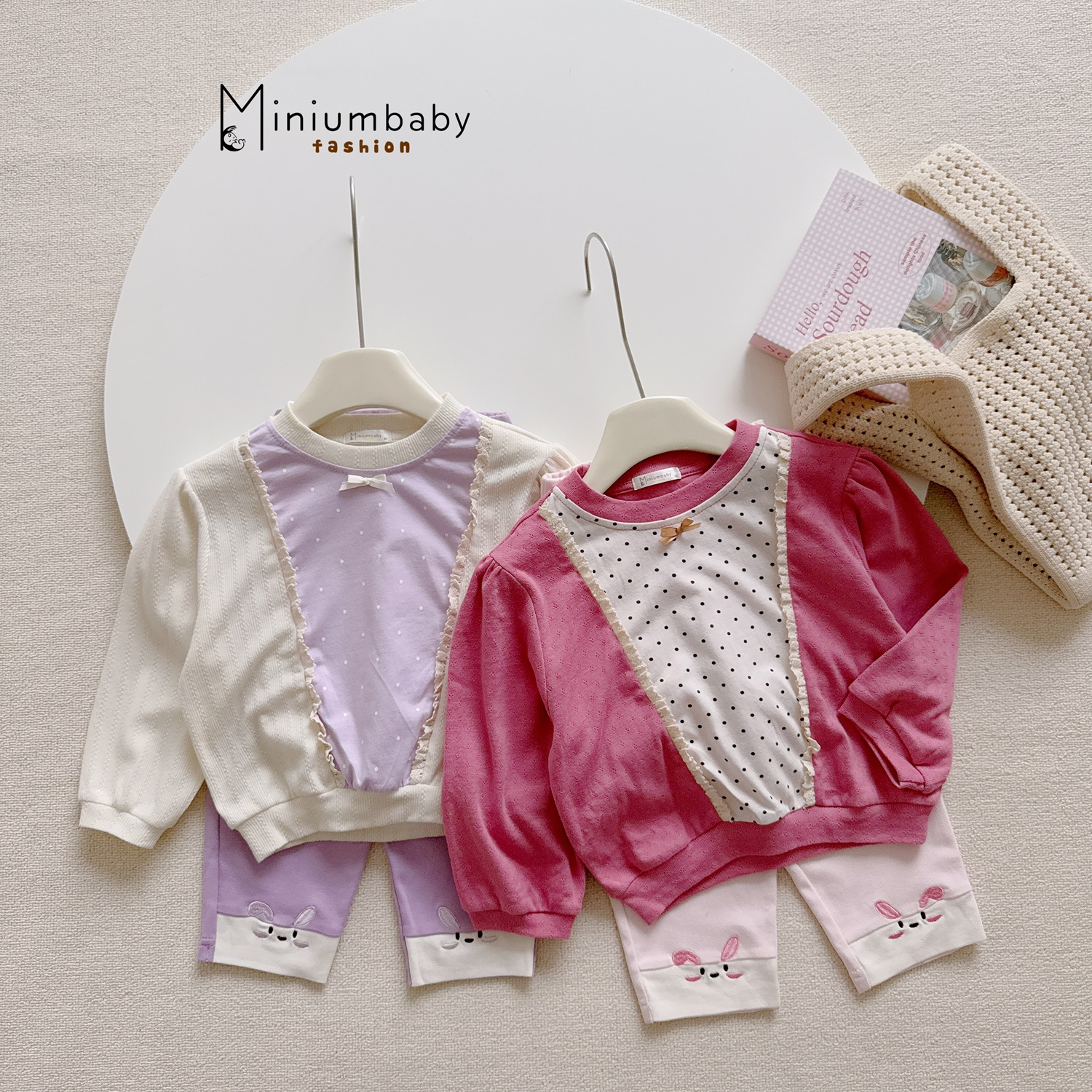 SB2213- bộ dài tay phối ngực đính nơ, quần in thỏ gấu quần