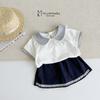 SB2426-bộ cộc tay bé gái phối cổ, gấu tay quần váy kẻ, cổ đính ren