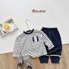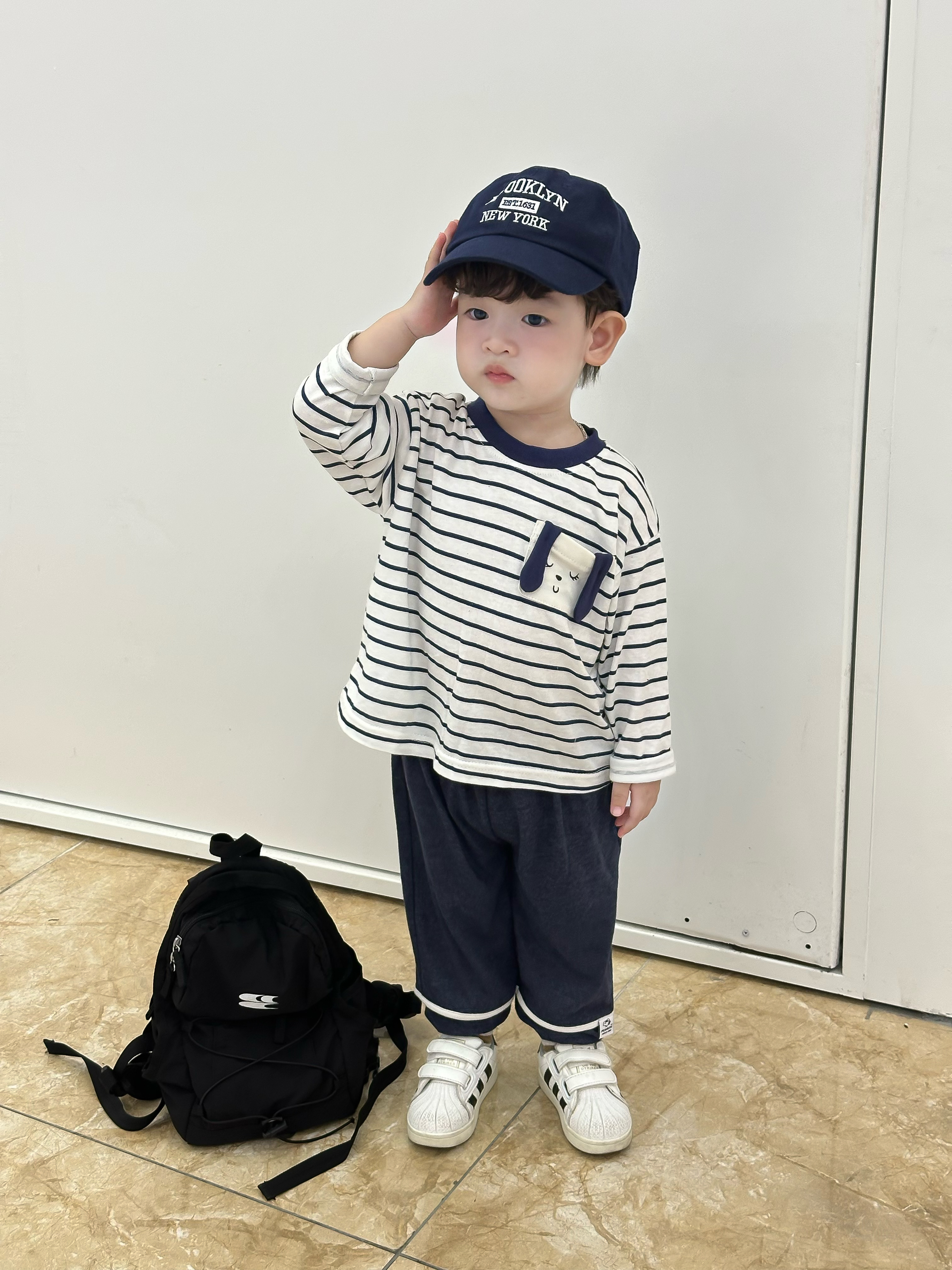 Bộ bé trai dài tay kẻ ngang túi ngực in cún đính tai