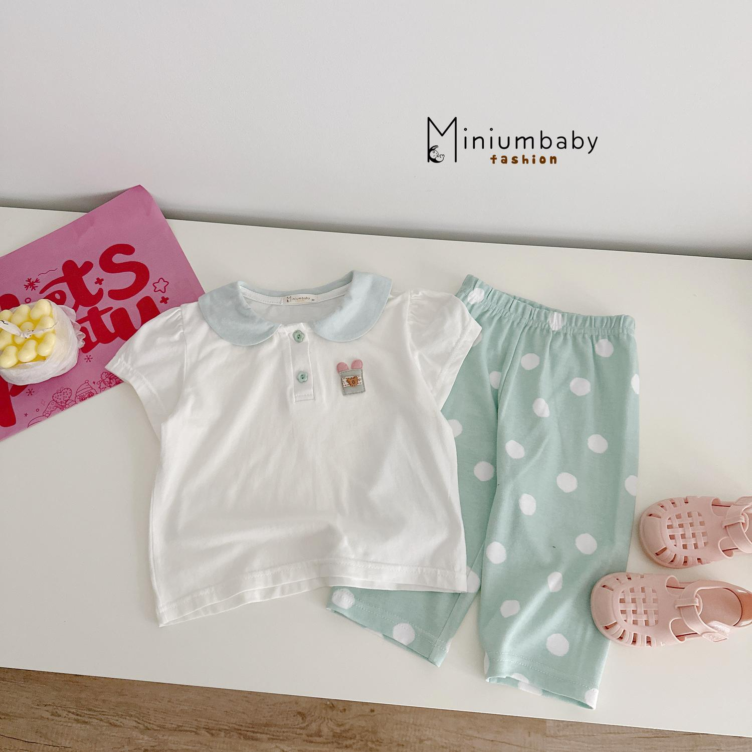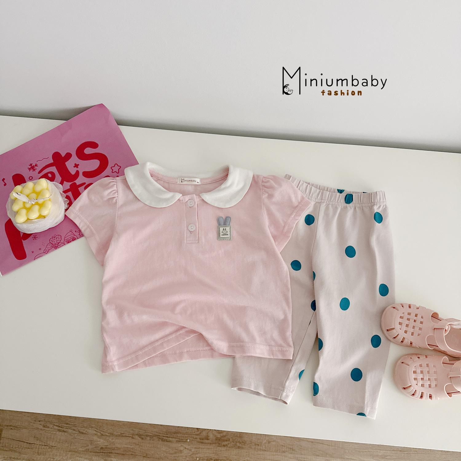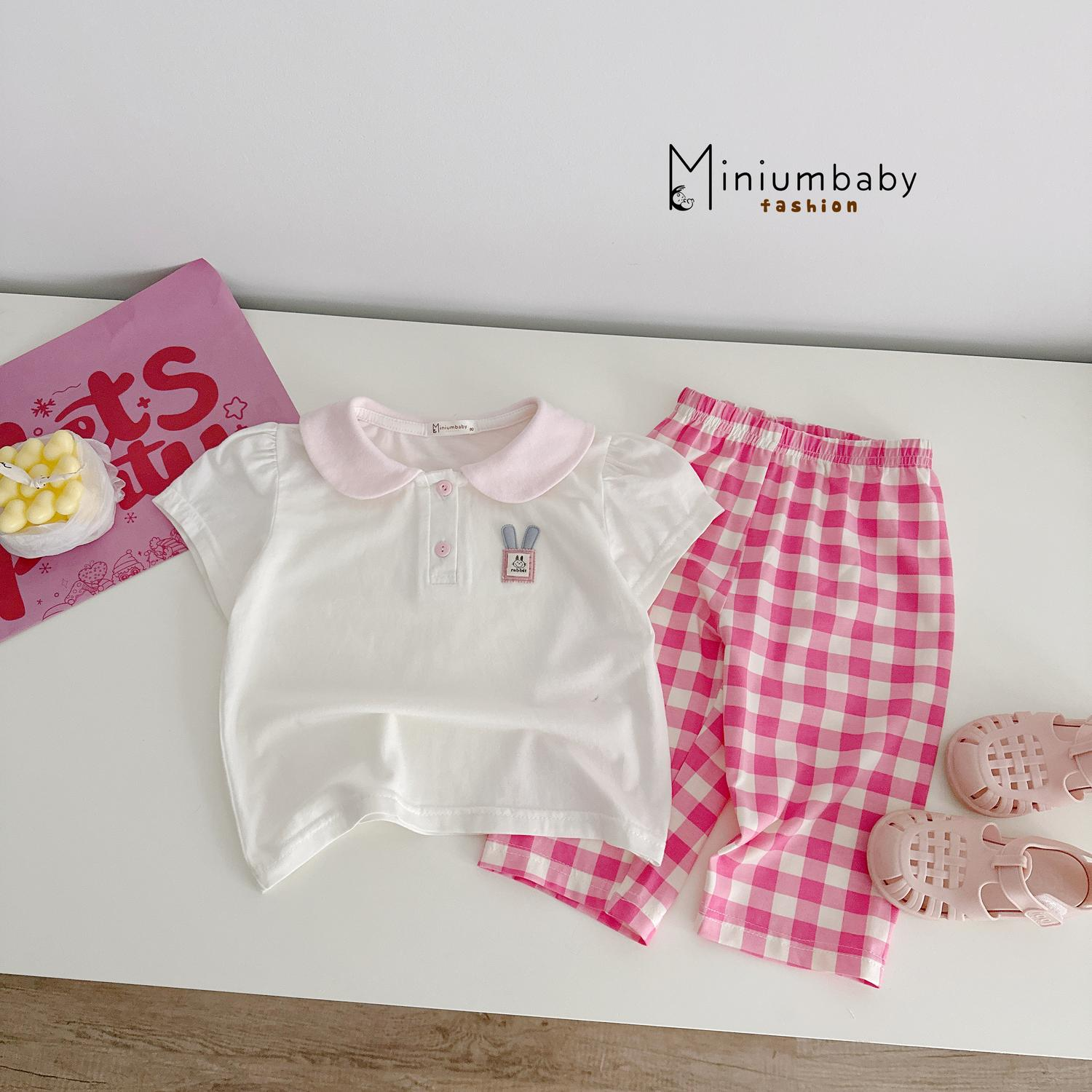 Bộ cổ sen quần lửng logo thỏ phối quần bi, kẻ