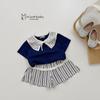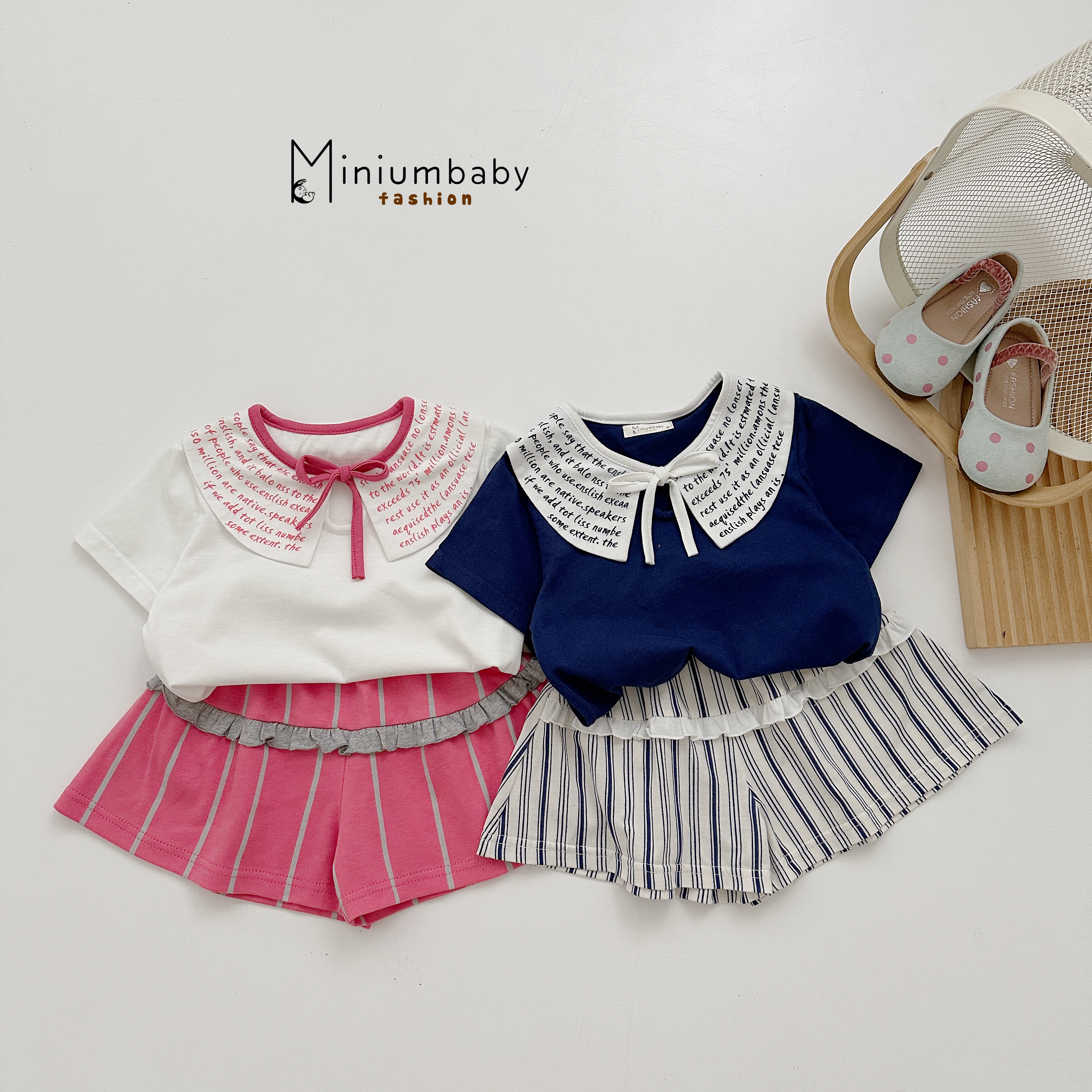 Bộ cộc cổ in chữ thắt nơ cổ, quần kẻ phối bèo