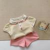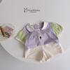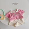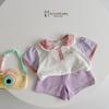 Bộ cộc tay cổ sen đính nơ, ren tay 2 tầng, quần tim bi màu