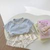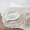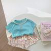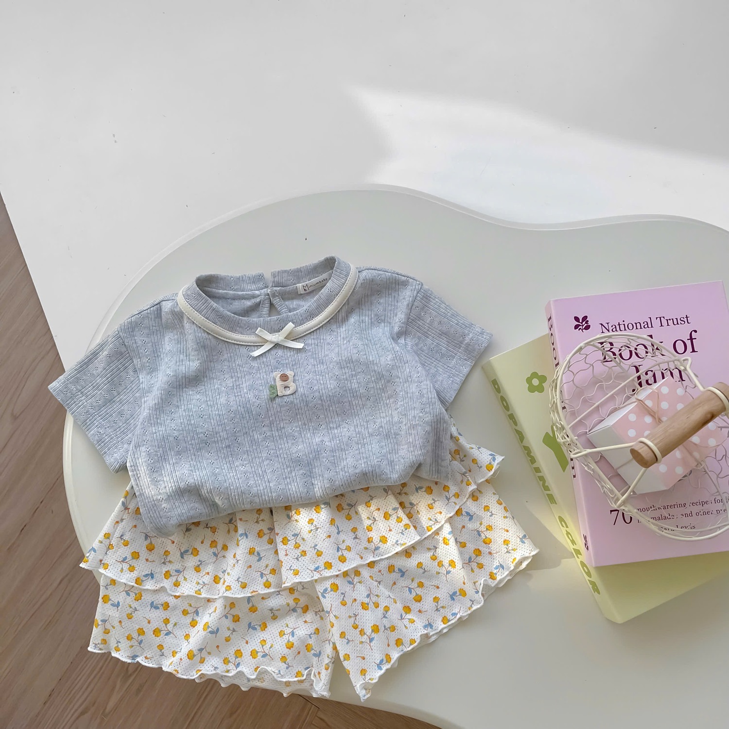 Bộ cộc tay phối viền cổ đính logo chữ B phối quần váy hoa