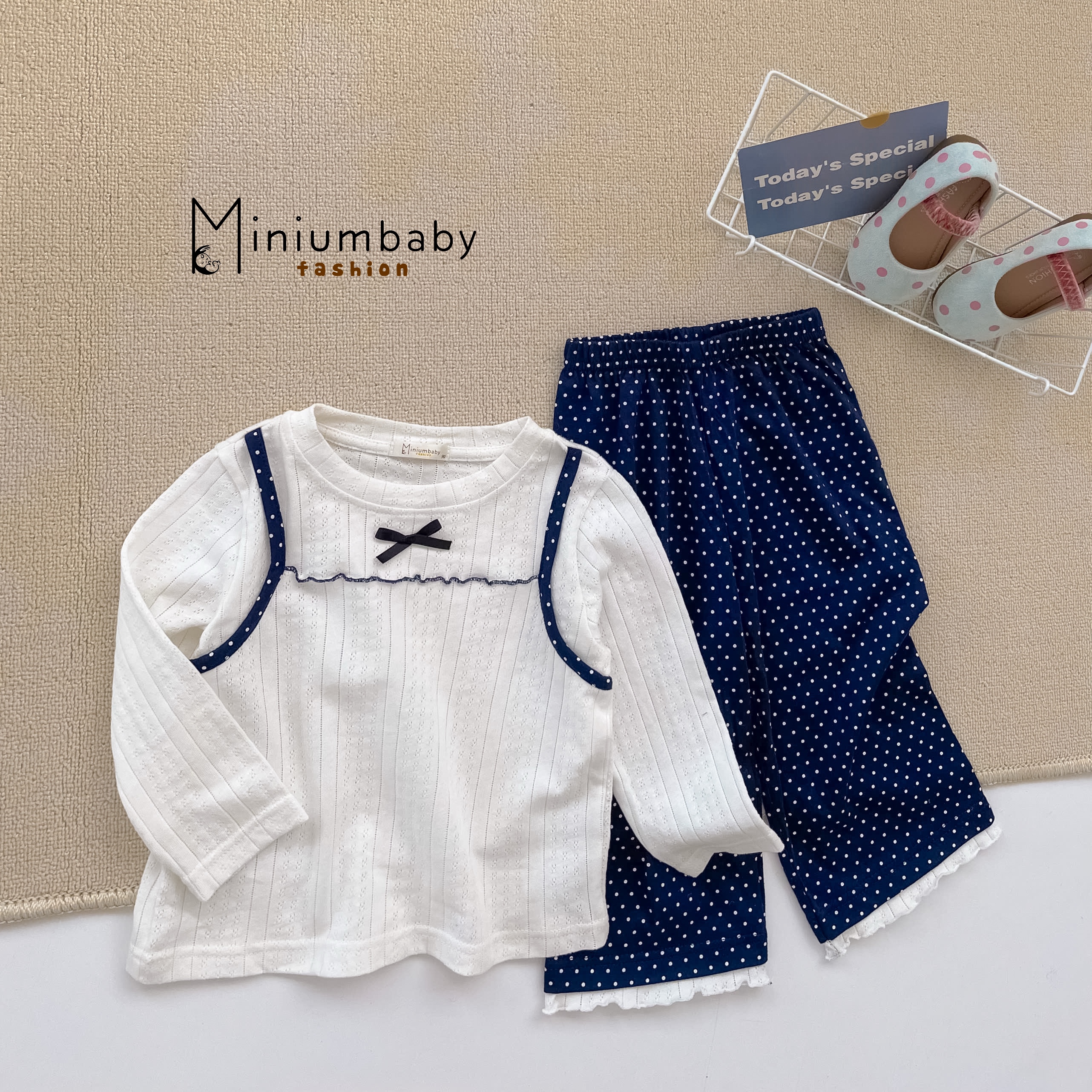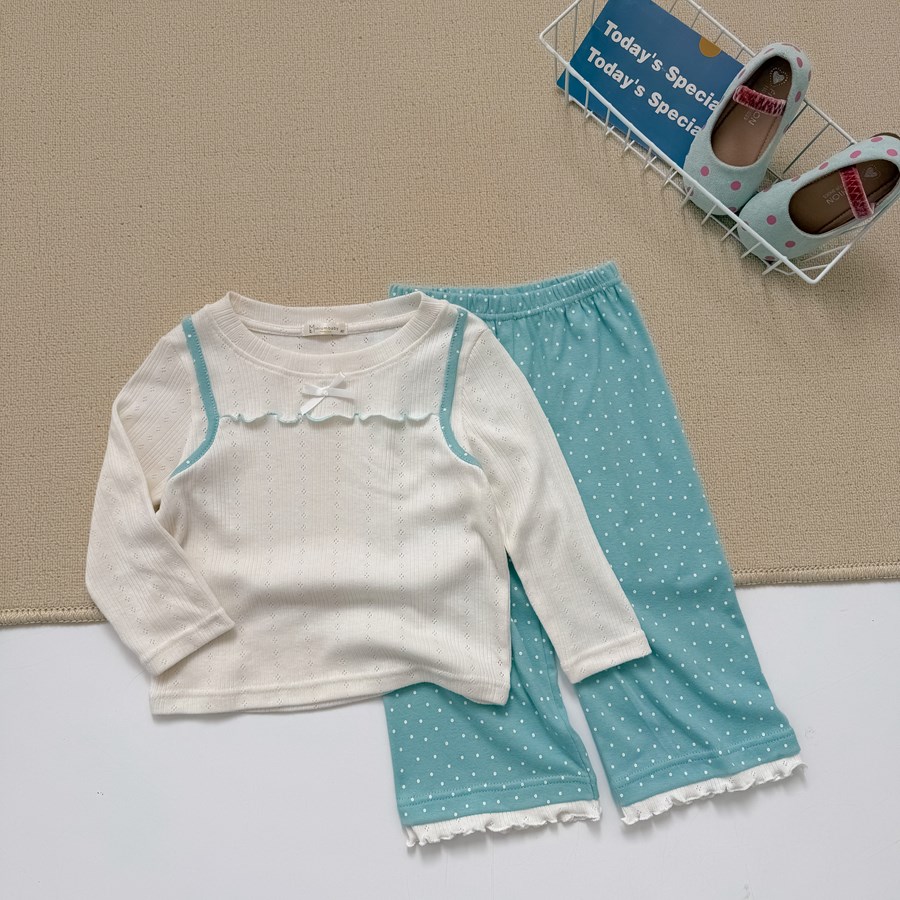 Bộ dài tay bé gái diễu nách đính nơ phối quần bi
