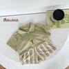 Bộ polo chấm tròn kẻ phối cổ nẹp, in cây ở nẹp